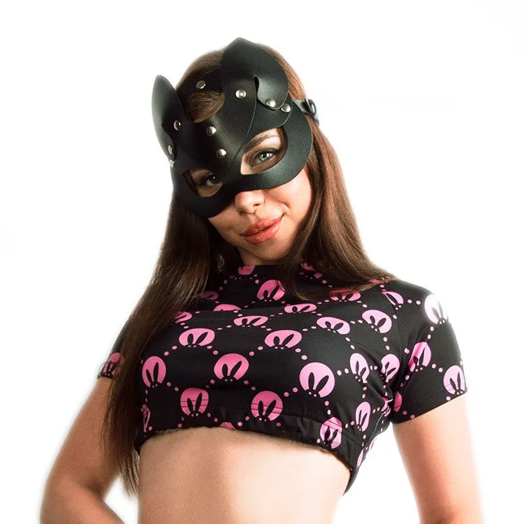 Чёрный кроп-топ облегающего силуэта с принтом в виде логотипа Pink Rabbit выгодно подчёркивает изгибы фигуры. Рукав реглан делает образ более женственным и эффектным. Эластичный и простой в уходе материал – бифлекс не сковывает в движениях.