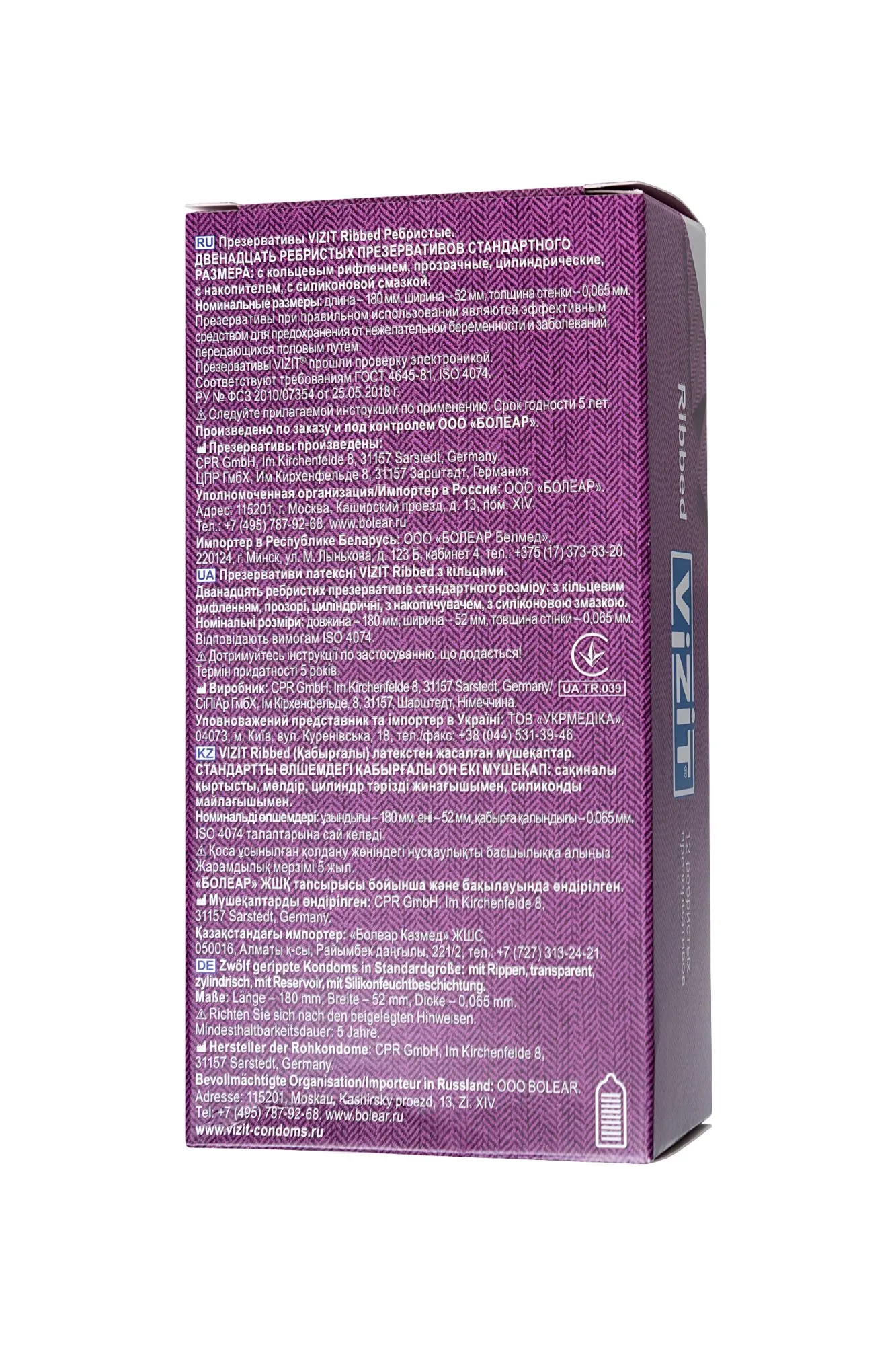 Презервативы VIZIT Ribbed Ребристые, латекс, 18 см О да, с презервативами VIZIT Ribbed вы доведете партнершу до пика наслаждения гораздо быстрее! Стоит впустить в свою интимную жизнь немного экспериментов, и удовольствие заиграет новыми красками. Не забудьте вооружиться презервативами VIZIT с ребристым рельефом. Представьте, как интенсивно будет ласкать кольцевое рифление нежную часть интимных мест в независимости от темпа вашего танца. Да, да и еще раз да! Вот что вы услышите во время близости. Наслаждение тесным контактом с дополнительной стимуляцией стало возможным с презервативами VIZIT Ribbed. Отдайтесь сладкому вожделению с головой, не думая о безопасности, с презервативами VIZIT Ribbed. Цилиндрическая форма контрацептивов с накопителем из эластичного латекса дарят уверенность в надежности и защите от нежелательных факторов. Попробуйте всю линейку презервативов VIZIT, чтобы найти свой идеальный контрацептив Лаконичный дизайн в виде пиджака и галстука, на котором изображен вид презервативов, легко поможет сделать выбор из широкого ассортимента контрацептивов VIZIT. Стильная упаковка и европейское качество презервативов VIZIT по привлекательной цене для вашего удовольствия. Эластичные – прочные и надежные Безопасные – натуральный латекс Силиконовая смазка – обеспечивает комфортный половой акт Длина 180 мм, ширина 52 мм Нейтральный запах – не отвлекает Количество штук в упаковке: 3 шт. Количество штук в упаковке: 12 шт