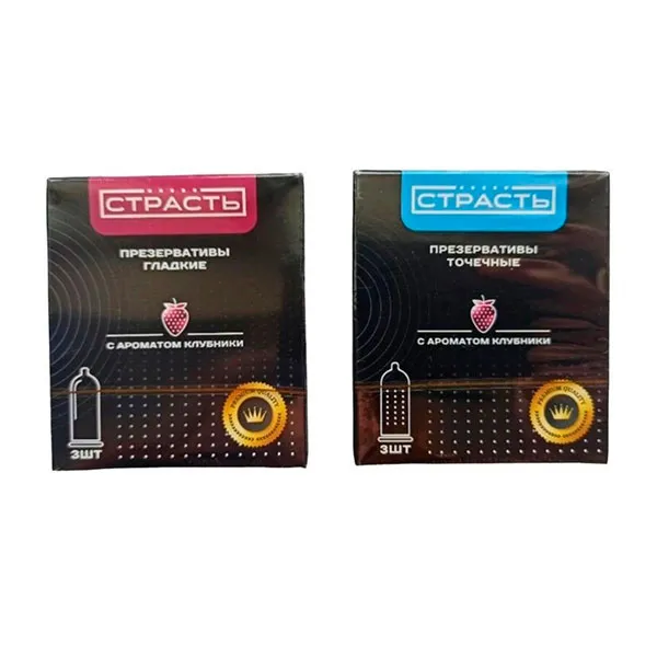 Презервативы «Страсть» из качественного натурального латекса с силиконовой смазкой и с ароматом клубники. Гладкие классические и с точечной текстурой. Можно любить друг друга, и не бояться ЗППП или нежелательной беременности. Презерватив покрыт силиконовой смазкой, идеально подходит для любого вида секса.