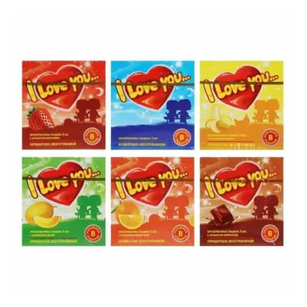 Презервативы I Love You. Яркая упаковка, узнаваемый дизайн. Шесть разных ароматов под любое настроение и наклейка-подарок в упаковке с признаниями в любви на разных языках мира. Гладкие презервативы нового поколения в силиконовой смазке с накопителем.