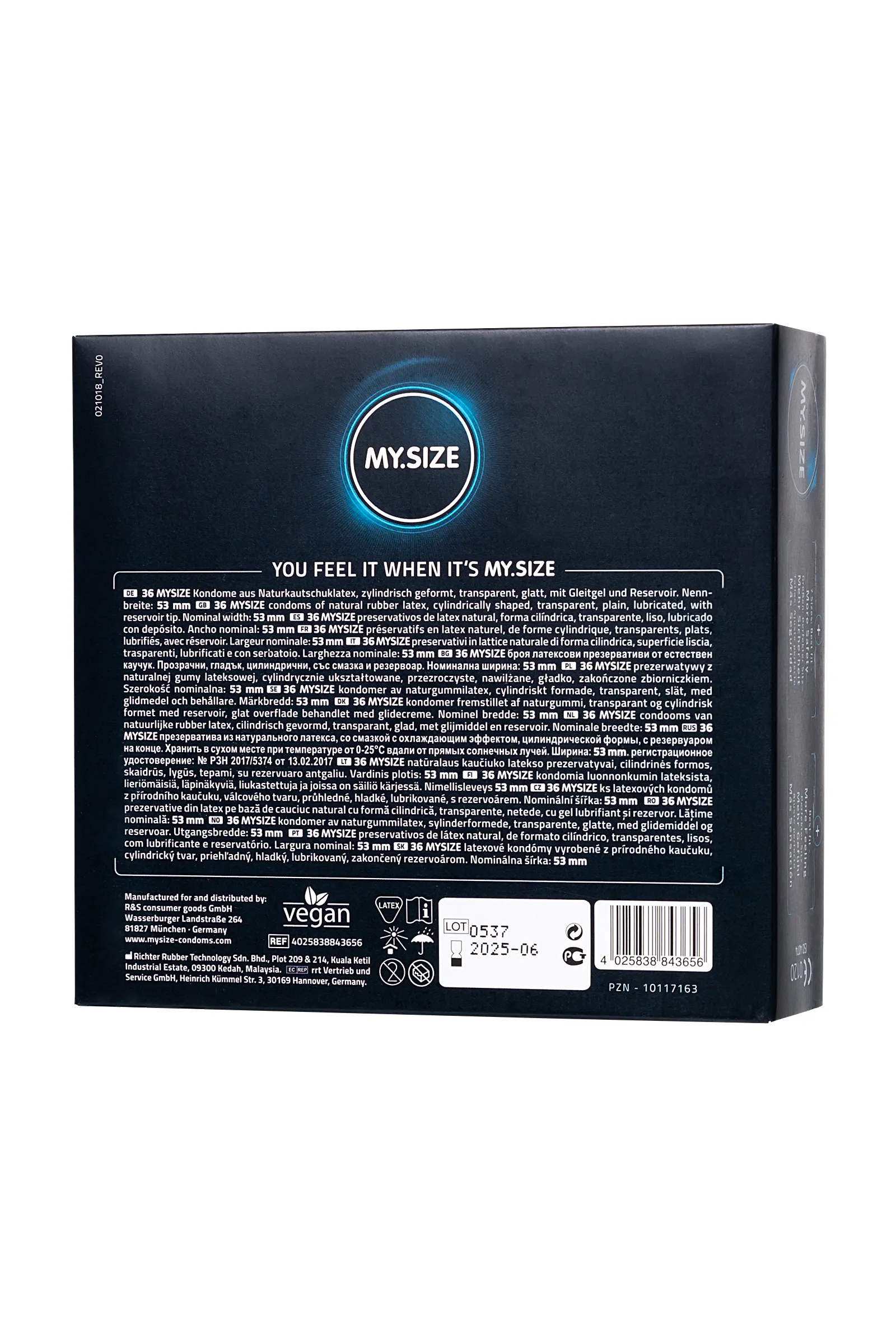 Если вы еще не знакомы с презервативами бренда MY.SIZE, значит, вы ничего не знаете о презервативах. Позвольте представить вам немецкие элитные презервативы MY.SIZE с сертификатами качества международных стандартов. Каждый мужчина уникален! Большинство имеет нестандартные формы и размеры. Несмотря на прочность и эластичность латекса, самой частой причиной разрыва и сползания презерватива является неправильно подобранный размер. MY.SIZE учел индивидуальность каждого мужчины и решил эту проблему, создав уникальный размерный ряд. MY.SIZE — это 7 размеров с идеальной посадкой от 47 до 69. Размерный номер означает половину длины окружности презерватива (ширину) в миллиметрах. Таким образом, идеальную посадку обеспечивает знание не длины, а окружности. Узнать свой размер можно двумя способами: измерить мерной лентой обхват эрегированного пениса и поделить результат на 2. открыть на смартфоне виртуальную линейку с помощью сайта mysize-condoms.ru. Наряду с широким размерным рядом и непревзойденным качеством у MY.SIZE много достоинств: Премиальное качество – чистый, натуральный латекс и гипоаллергенная силиконовая смазка Идеальные по размеру – больше безопасности, больше удовольствия, больше комфорта. Линейка и подробная инструкция в каждой коробке. Широкий размерный ряд – единственные в России презервативы, учитывающие индивидуальные анатомические особенности Упаковка 36 презервативов – выгодно и удобно. Не ограничивайте себя в удовольствии. Экологически безопасные и имеют маркер Vegan - в их изготовлении не используют продукты животного происхождения. Упаковка презервативов не содержит полиэтилен, а сами пачки биоразлагаемые. Длина 178 мм, диаметр 53 мм Количество в коробке – 36 шт. Производитель – R&S Consumer goods GmbH, Германия Единожды узнав свой размер, вы навсегда измените качество секса, забыв о дискомфорте во время полового акта. Только естественные и яркие ощущения!