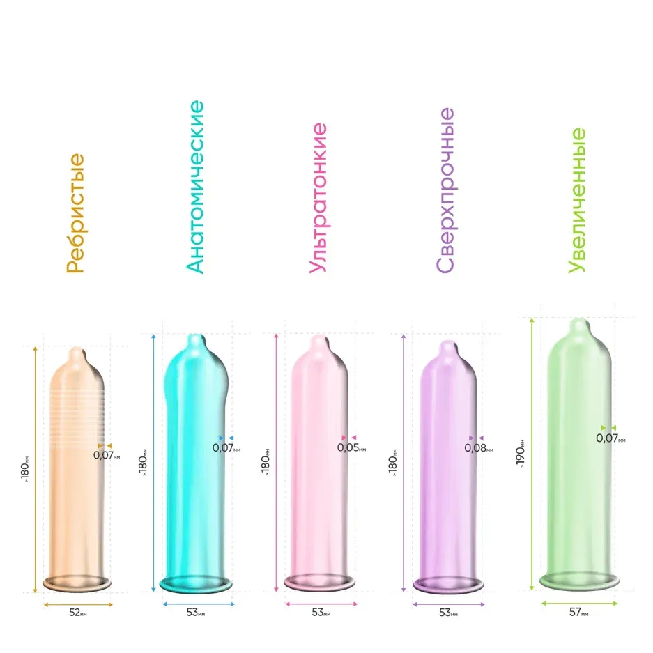 1. Цветные и ароматизированные — помогут внести разнообразие в любовную жизнь! 3 аромата: черный — шоколад, красный — клубника, желтый — банан.2. Анатомической формы — контурный презерватив расширен в области головки, что дает повышенный комфорт посадки.