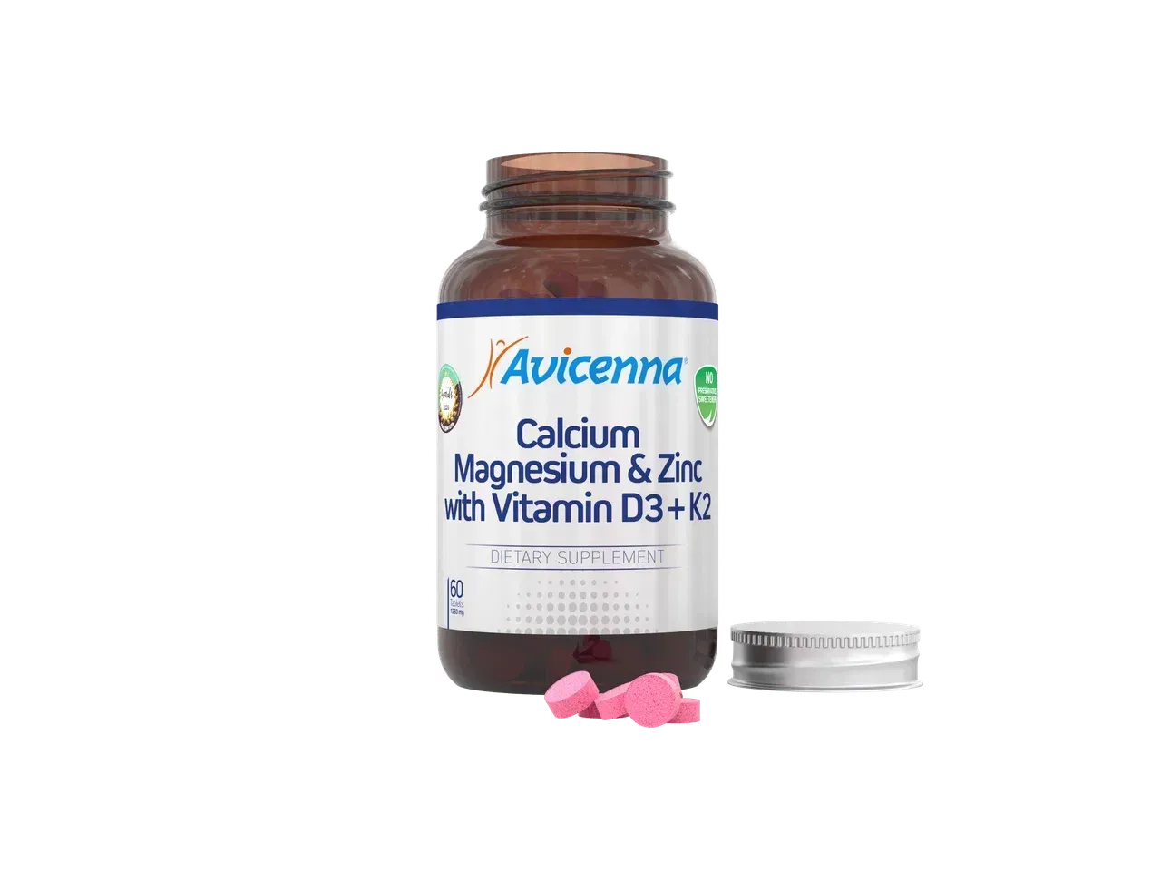 Кальция карбонат, моногидрат лактозы, магния оксид, микрокристаллическая целлюлоза (Е460i - агент антислеживающий), поливинилпролидон (Е1201 - носитель), цинка сульфат, магниевая соль стеариновой кислоты (Е470-агент антислеживающий), менахинон (витамин К2), краситель понсо 4R (Е124), холекальциферол (витамин D3)