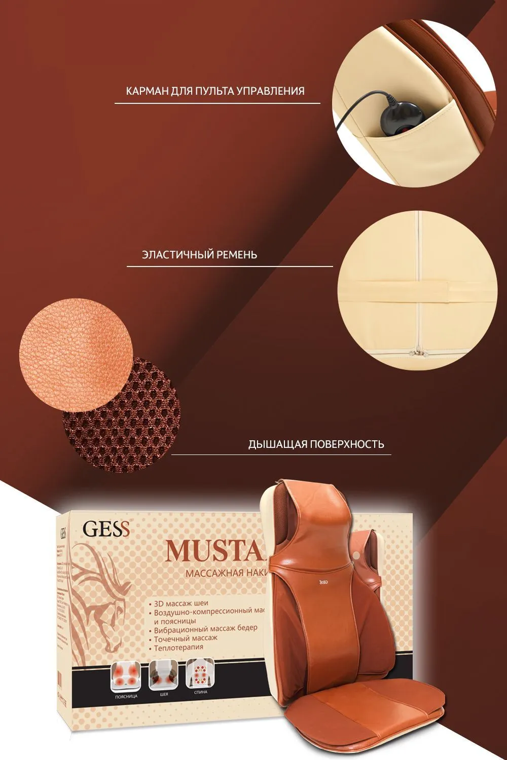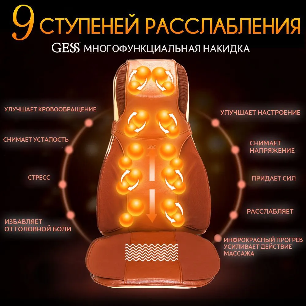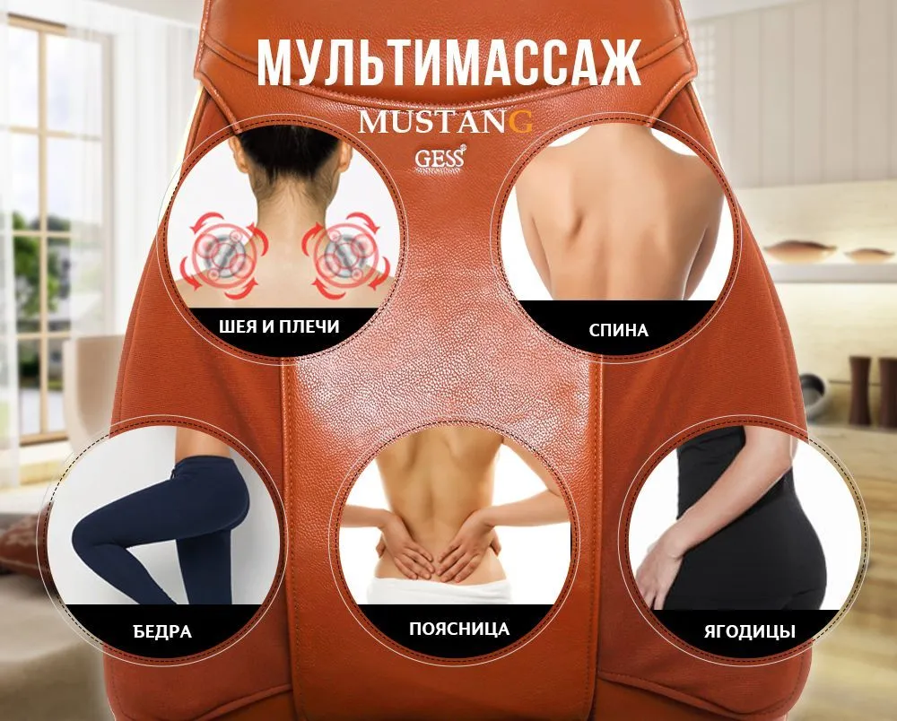особенности массажной накидки Mustang. Кроме роликовых и вибрационных механизмов, накидка Gess Mustang оснащена 9-ю воздушными подушками, позволяющими проводить воздушно-компрессионный массаж поясницы и бедер, а так же имитировать приемы мануальной терапии и функцию «скручивания». Еще одной отличительной особенностью массажера Gess-17 является четырех роликовый механизм в шейном отделе, позволяющий проводить максимально эффективный 3D массаж шейно-воротниковой зоны.