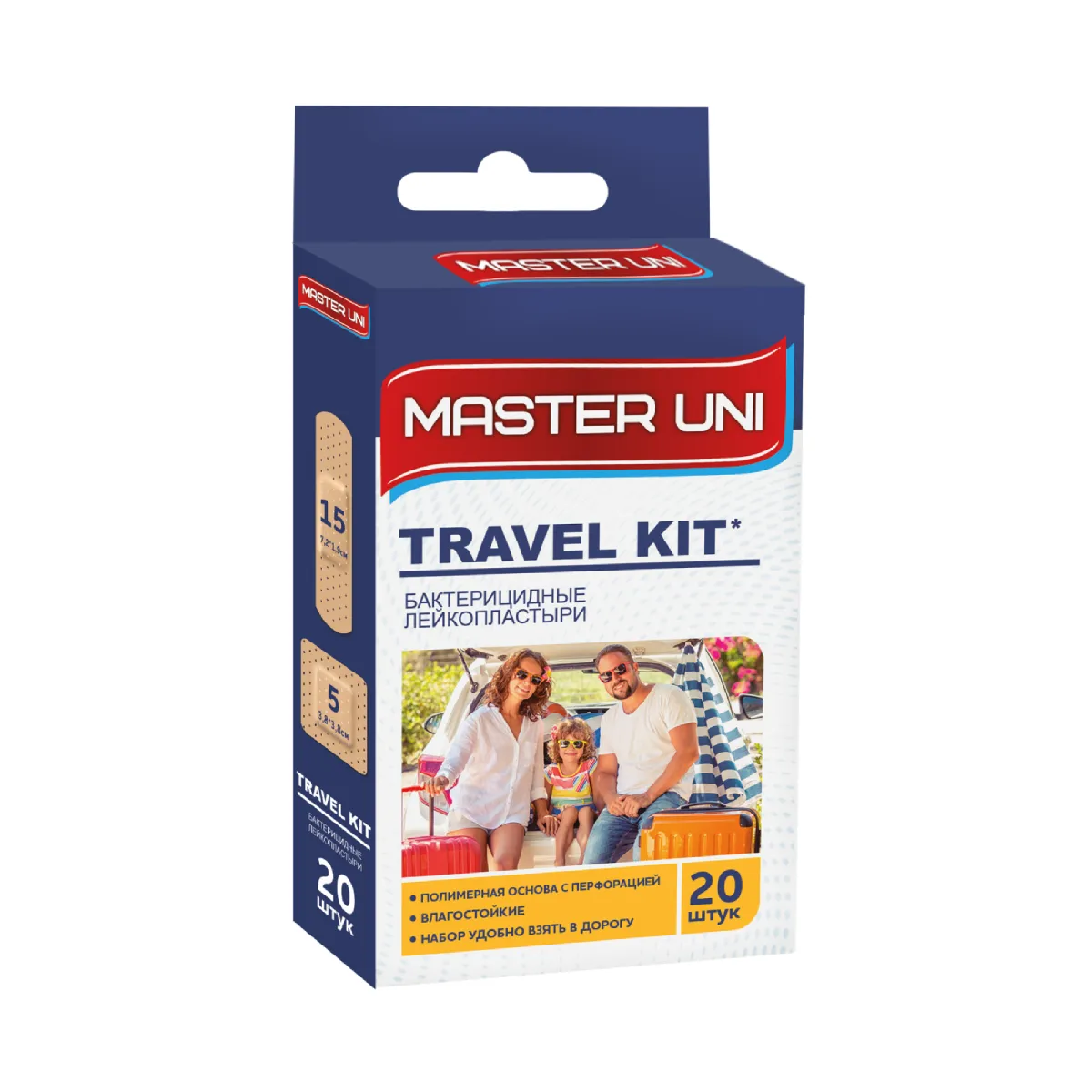 Лейкопластырь бактерицидный на полимерной основе телесного цвета с перфорацией для лучшей циркуляции воздуха. Влагоустойчивый. Набор MASTER UNI TRAVEL KIT удобно брать с собой в дорогу. В него входят 20 пластырей разного размера. Пластырь надёжно предохраняет мелкие раны и ссадины от загрязнений.