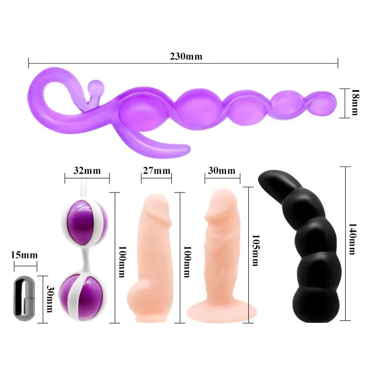 В набор входят: виброяйцо серебристое( диаметр:1,5 см х длина:3,5 см), вагинальные шарики розовые(диаметр 3,2 см х Длина 10см.), анальный стимулятор синий(длина:23см х диаметр:1,8 см), Анальная насадка розовый рельефная(длина: 14см). Насадка анальная розовая в виде фалоса ( длина:10см. х диаметр: 2,7см),Насадка анальная телесная в виде фалоса ( длина:10,5см х диаметр:3см)