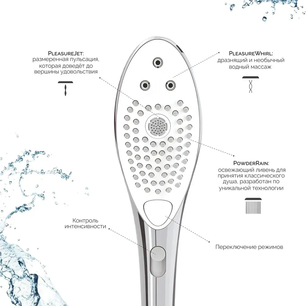 Wave устройство 2 в 1, которое можно использовать как обычную насадку для душа, так и в качестве клиторального стимулятора. 3 режима работы обеспечивают разнообразие ощущений от струй воды. PleasureJet и PleasureWhirl созданы специально для стимуляции деликатных зон, а режим PowderRain для обычного использования насадки в качестве лейки для душа. Простой в управлении Wave оснащен всего одной кнопкой на корпусе, которая отвечает за скорость и интенсивность подачи воды.