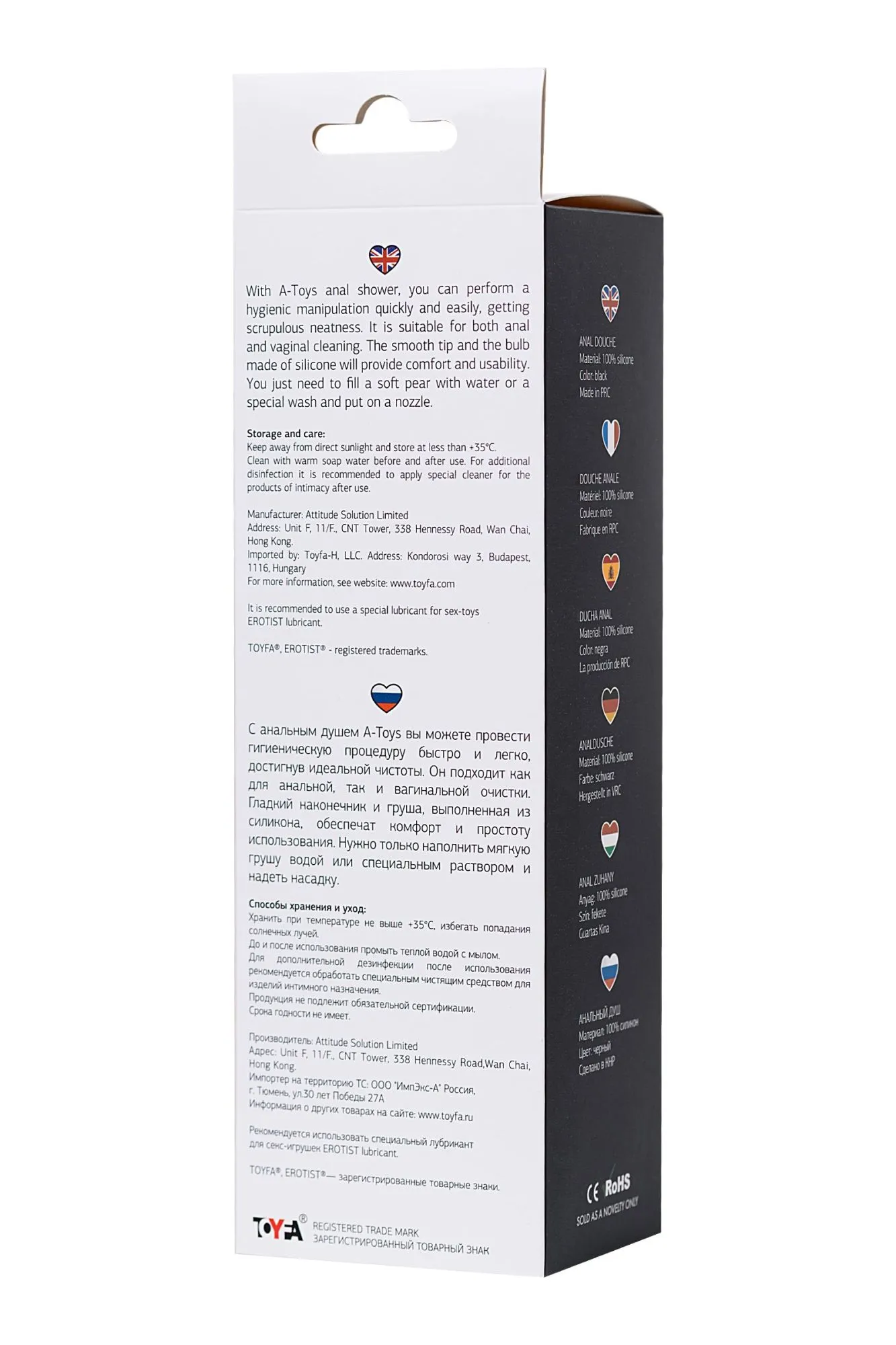 С анальным душем A-Toys вы можете провести гигиеническую процедуру быстро и легко, достигнув идеальной чистоты. Он подходит как для анальной, так и вагинальной очистки. Гладкий наконечник и груша, выполненная из силикона, обеспечат комфорт и простоту использования. Нужно только наполнить мягкую грушу водой или специальным раствором и надеть насадку.
