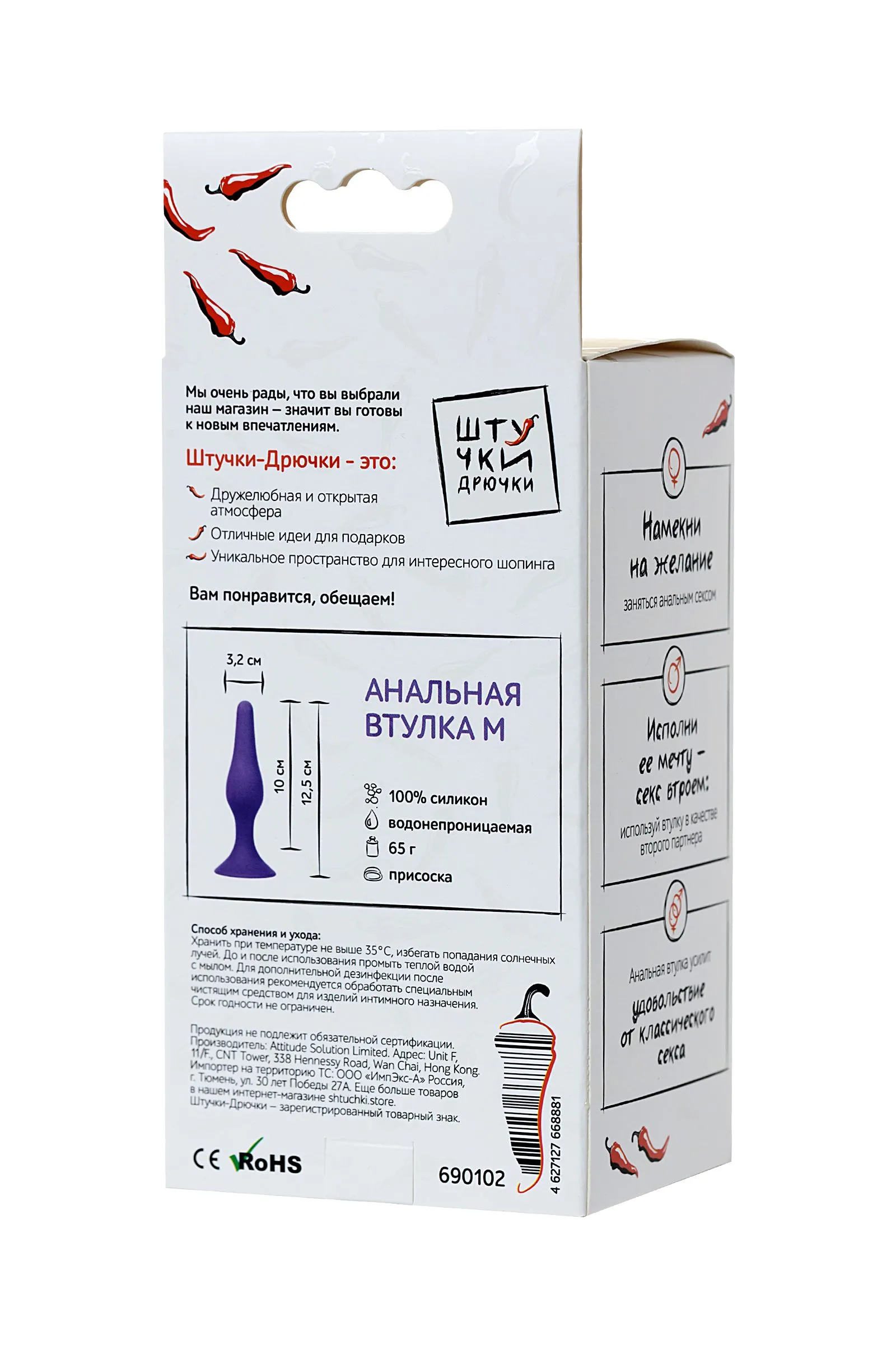 Откройте новые ощущения с анальными пробками Штучки-Дрючки! Она выполнена из безопасного, долговечного и простого в уходе высококачественного 100 % медицинского силикона. Игрушка разработана специально для новичков в области анальных удовольствий. Узкий кончик максимально облегчает ввод, а ограничительное основание в виде присоски делает ее безопасной в использовании и позволяет надежно закреплять на плоских поверхностях. С анальными пробками Штучки-Дрючки незабываемое удовольствие вам гарантировано!
