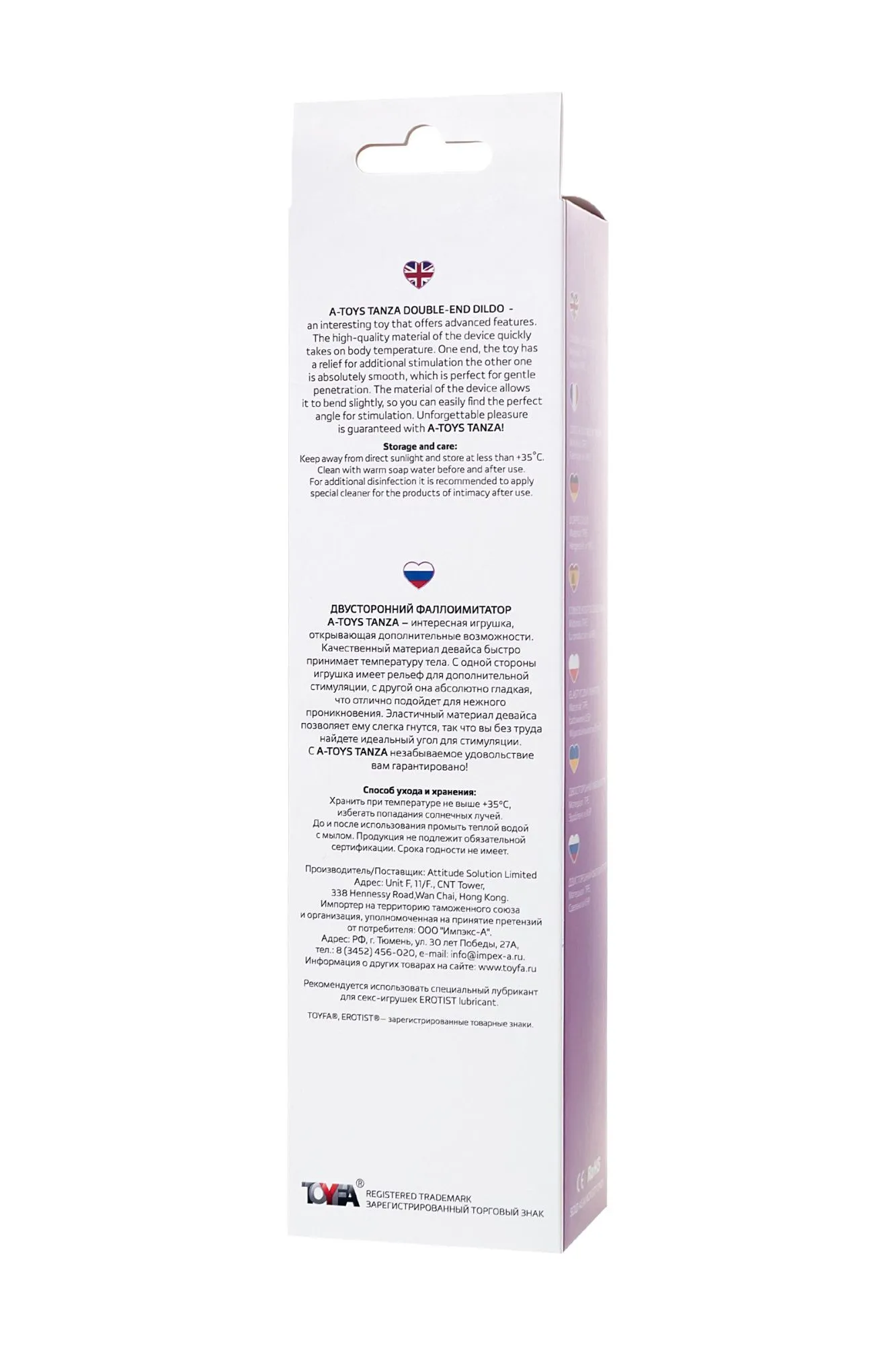 Двусторонний фаллоимитатор A-Toys Tanza – интересная игрушка, открывающая дополнительные возможности. Качественный материал девайса быстро принимает температуру тела. С одной стороны игрушка имеет рельеф для дополнительной стимуляции, с другой она абсолютно гладкая, что отлично подойдет для нежного проникновения. Эластичный материал девайса позволяет ему слегка гнутся, так что вы без труда найдете идеальный угол для стимуляции. С A-Toys Tanza незабываемое удовольствие вам гарантировано! Общая длина: 27,5 см Диаметр: 2,7-3,1 см