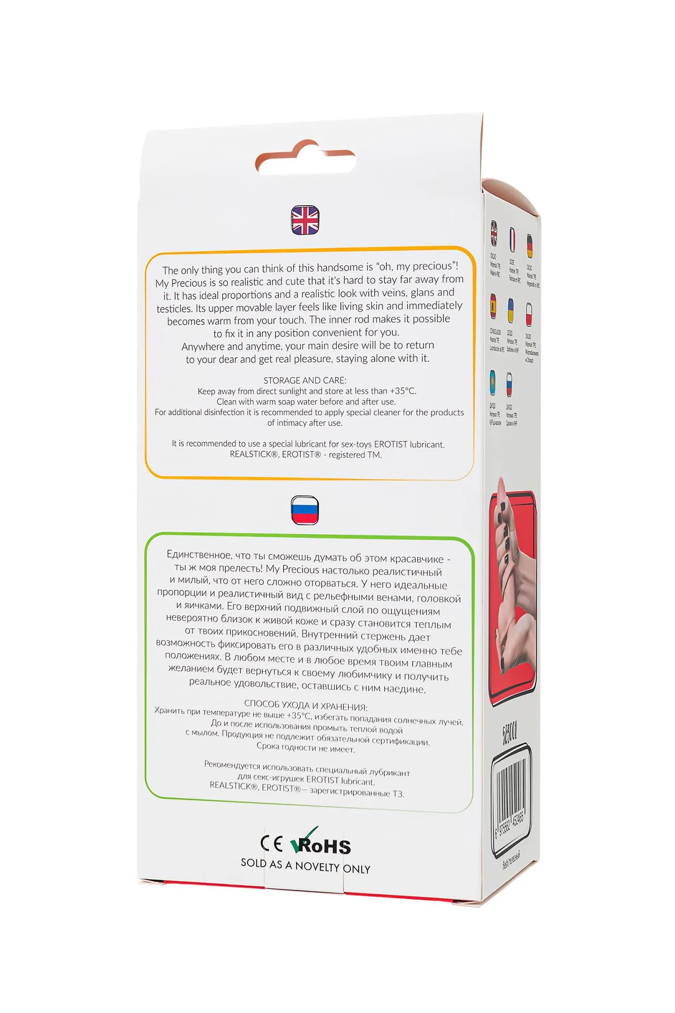 Знакомьтесь, My Precious – настоящее воплощение искусства удовольствия! Этот фаллоимитатор из линейки My Babe от бренда RealStick добавит вашей интимной жизни неповторимые моменты наслаждения. Его длина 17 см и диаметр 4,5 см позволяют наслаждаться каждым движением. Что делает My Precious особенным? Это движущаяся кожа, создающая невероятно реалистичные ощущения. Верхний слой, близкий по текстуре к живой коже, нагревается от ваших прикосновений, создавая атмосферу настоящего интимного контакта. Рельефные вены, скрытая головка и упругие яички делают этого красавчика максимально похожим на натуральный пенис. Нежный, эластичный и упругий материал TPE на ощупь как человеческая кожа. Хорда внутри придает ему упругость, а частично скрытая головка добавляет нотку загадки и усиливают реалистичность. Внутренний стержень предоставляет возможность фиксировать My Precious в различных удобных для вас положениях, удовлетворяя ваши индивидуальные предпочтения. Благодаря мощной присоске в основании, его можно использовать как страпон, а также для закрепления на любых ровных поверхностях. Он легко составит компанию в душе и ванной. Чтобы ваша игрушка радовала вас долго, используйте лубрикант на водной основе и пудру для игрушек. С My Precious вы сможете погрузиться в мир истинного удовольствия в любом месте и в любое время. Оставайтесь с ним наедине и позвольте себе настоящее наслаждение, которое будет запоминаться надолго. Вагинальный или анальный секс – выбор за вами, но не забудьте воспользоваться презервативом, если хотите побаловать себя анальными ласками. Упругая мошонка с присоской служат надежным ограничителем. Материал - TPE Оттягивающаяся кожа Общая длина 17,5 см
