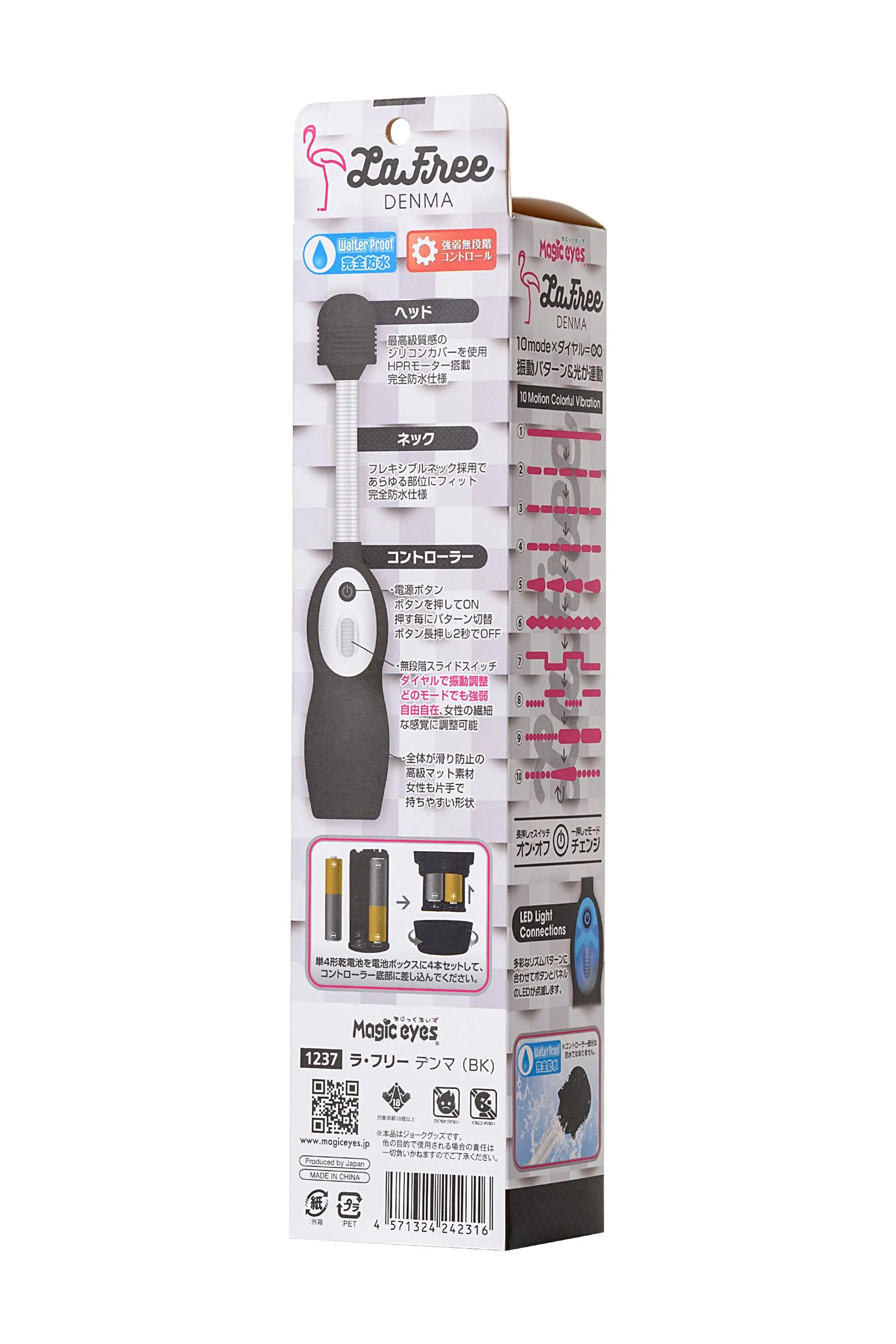 LaFree DENMA Magic Eyes — японский вибромассажер, который делает повседневную жизнь приятнее. Он легко совмещает в себе полезный функционал сразу двух устройств: мощного массажера и стимулятора эрогенных точек. С ним вам не придется выбирать между яркой сексуальной разрядкой и расслабляющим массажем. Просто попробуйте пройтись большой силиконовой головкой массажера по отдельным участкам тела. Почувствуйте, как отменно прорабатывают их 10 режимов вибрации. А потом согните «шею» стимулятора под нужным вам углом наклона, чтобы познакомиться с магией точечного массажа. Используйте LaFree DENMA Magic Eyes во время прелюдии для стимуляции клитора, после изнурительных тренировок включайте его для снятия усталости или массируйте им проблемные зоны — вам понравится его эффективная работа в любом сценарии. Подходит для возбуждающего, расслабляющего и антицеллюлитного массажа. Обладает водонепроницаемой поверхностью для комфортной очистки вибромассажера. Произведен из проверенных и безопасных для здоровья материалов, которые прослужат долгие годы. Позвольте своей жизни заиграть новыми красками с японским вибромассажером LaFree DENMA Magic Eyes