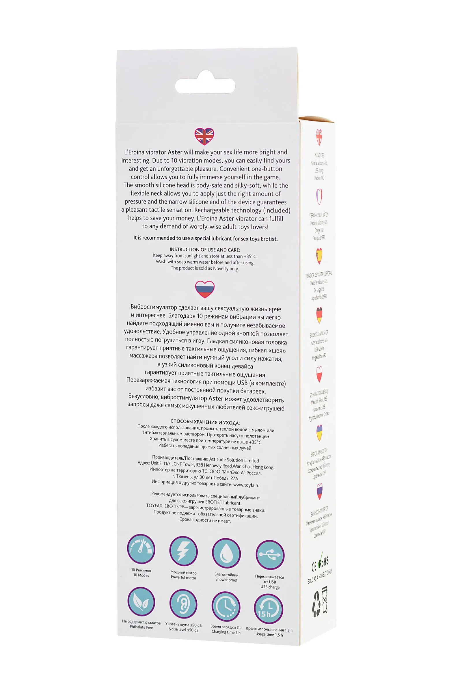 Вибростимулятор Aster сделает вашу сексуальную жизнь ярче и интереснее. Благодаря 10 режимам вибрации вы легко найдете подходящий именно вам и получите незабываемое удовольствие. Удобное управление одной кнопкой позволяет полностью погрузиться в игру. Гладкая силиконовая головка гарантирует приятные тактильные ощущения, гибкая «шея» массажера позволяет найти нужный угол и силу нажатия, а узкий силиконовый конец девайса гарантирует приятные тактильные ощущения. Перезаряжаемая технология при помощи USB (в комплекте) избавит вас от постоянной покупки батареек. Безусловно, вибростимулятор Aster может удовлетворить запросы даже самых искушенных любителей секс-игрушек!