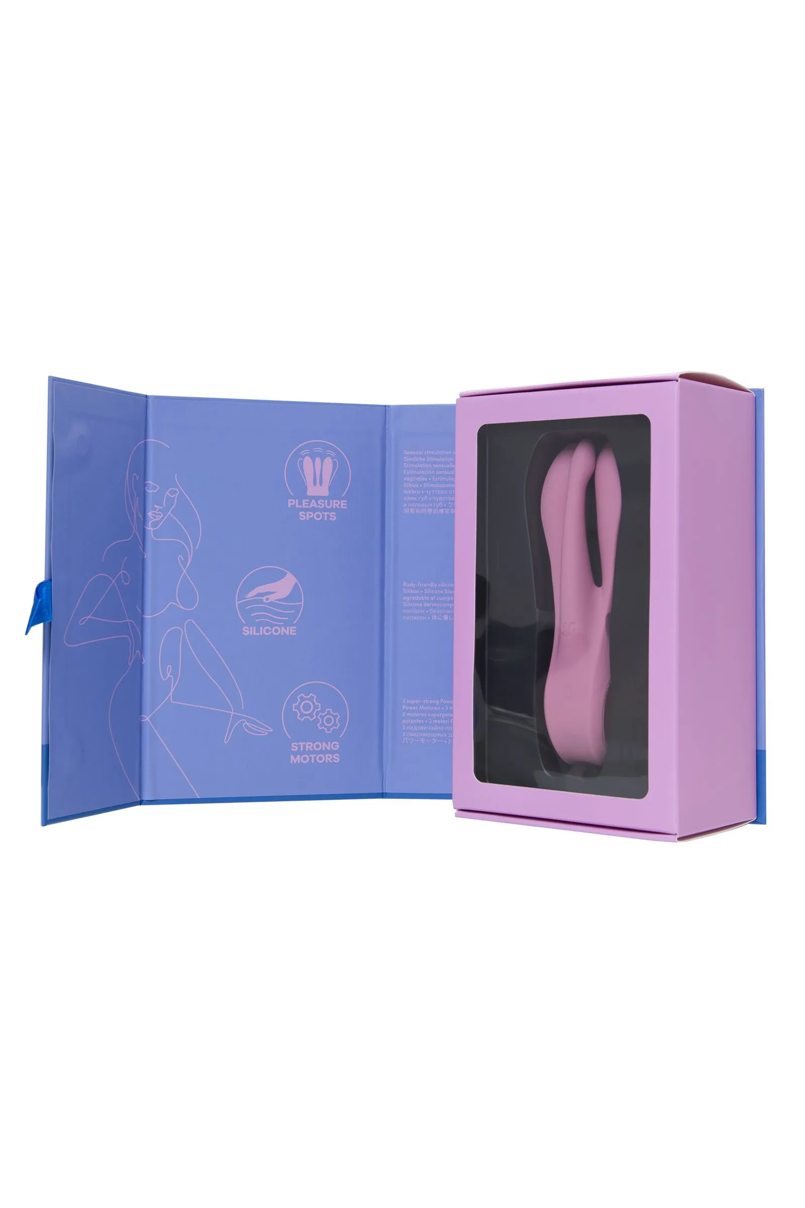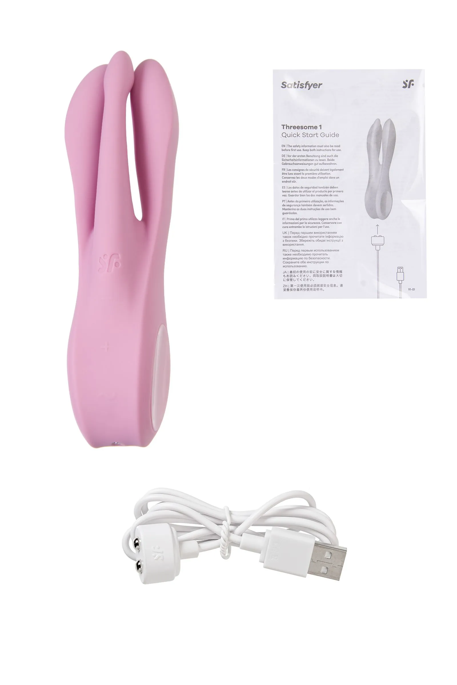Необычный вибратор Threesome 1 от Satisfyer способен подарить особое удовольствие благодаря уникальной форме. Форма ствола вибратора имеет три гибких отростка-пальчика. Threesome 1 – это многофункциональный вибратор для стимуляции активных эрогенных зон. С ним вы легко осуществите самые смелые фантазии, даже о “тройничке”. Вибратор отлично дополнит парные развлечения и соло-игру. 3 гибких вибрирующих отростка отлично стимулируют клитор, вульву, пенис, соски и любые другие эрогенные зоны. Используйте необычную форму как проникающий вибратор или для внешней стимуляции. Каждый отросток оснащен мощным двигателем. 3 мощных мотора пробуждают волны наслаждения, передавая вибрационные ритмы по всей игрушке, стимулируя самые чувствительные области вашего тела и улучшая сексуальное здоровье. Два боковых отростка более объемные, третий отросток в центре – поменьше, имеет отдельное управление вибрацией. Игрушка имеет по 12 паттернов вибрации на боковых и среднем отростках, управляется легко и интуитивно кнопками на передней панели. Ручка с боковыми углублениями позволяет вибратору уверенно и комфортно лежать в руке в самых разнообразных позициях и при любой интенсивности движений. Плавные изгибы и аккуратный рельеф обеспечивают легкое проникновение. Шелковистое силиконовое покрытие — фирменный знак Satisfyer, тактильно нежный и приятный на ощупь, он быстро адаптируется к температуре вашего тела. Чтобы получить максимум удовольствия и сохранить материал в наилучшем виде, рекомендуется пользоваться качественной смазкой на водной основе. После использования обязательно очищайте вибратор теплой водой со специальными бактерицидными спреями для интимных товаров. Особенности: 3 мощных автономных мотора Мультифункциональные гибкие отростки-пальчики подстраиваются под анатомию индивидуально Многовариантность использования в паре и соло Необычная и эргономичная форма 12 режимов вибрации для каждого мотора. Нежный розовый цвет и мягкий, эластичный силикон без запаха, без аллергенов и вредных для здоровья веществ. Возможность использовать игрушку в ванной и душе благодаря полной водонепроницаемости (до 30 минут на глубине до 1 метра) – IPX7. Время работы 60 минут. Перезаряжаемый, магнитный USB-кабель, время зарядки 3 часа.