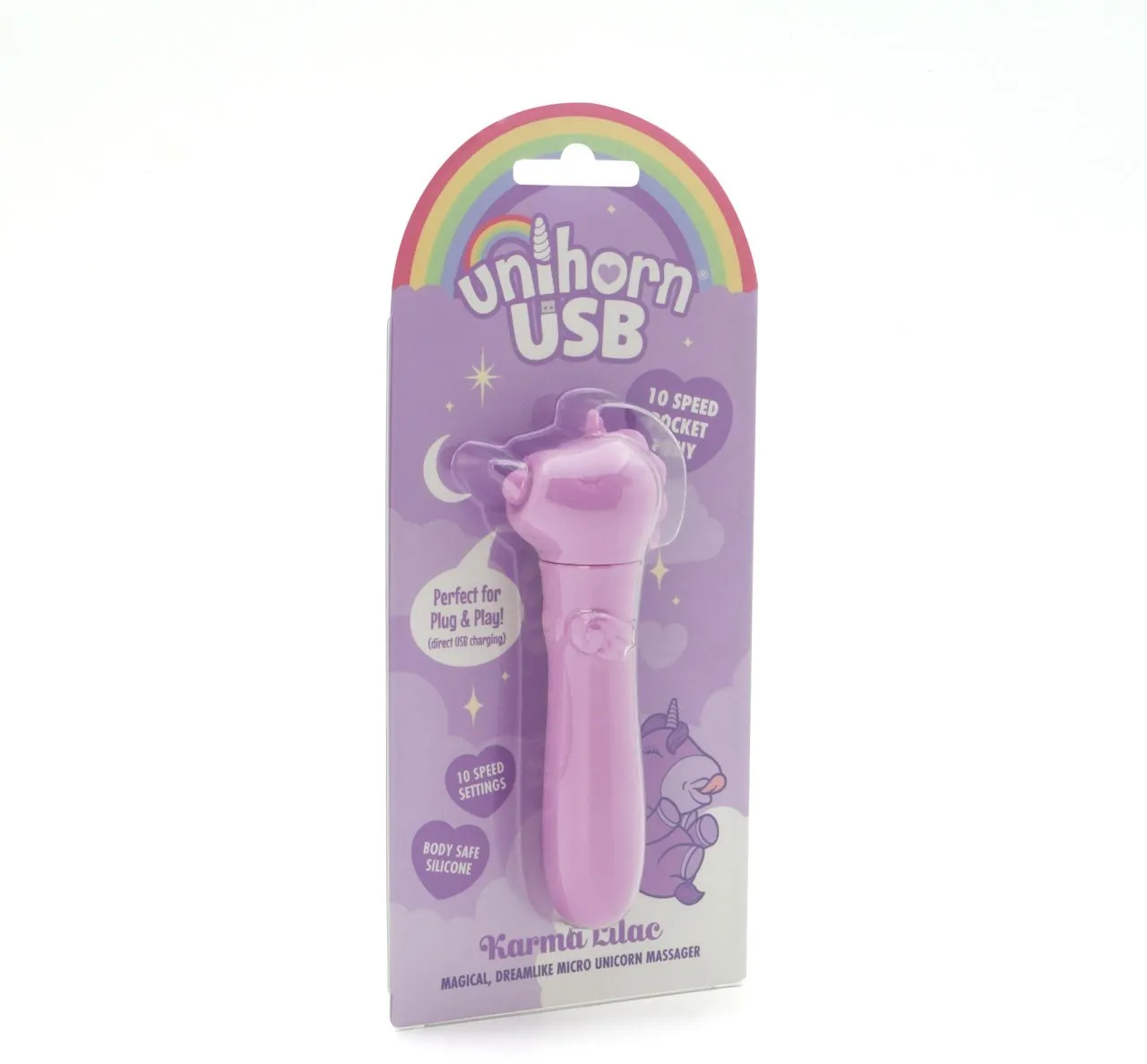 Испытайте мгновения волшебства с USB Karma Lilac Unihorn, в котором гармонично сочетаются причудливое очарование и мощная производительность! Эта очаровательная вибропулька в виде единорога - ваш сказочный спутник для ненавязчивого удовлетворения в дороге. Его шелковистый, безопасный для тела силикон и 10 очаровательных скоростных режимов доставят вам незабываемые ощущения, куда бы вы ни отправились в своих приключениях.