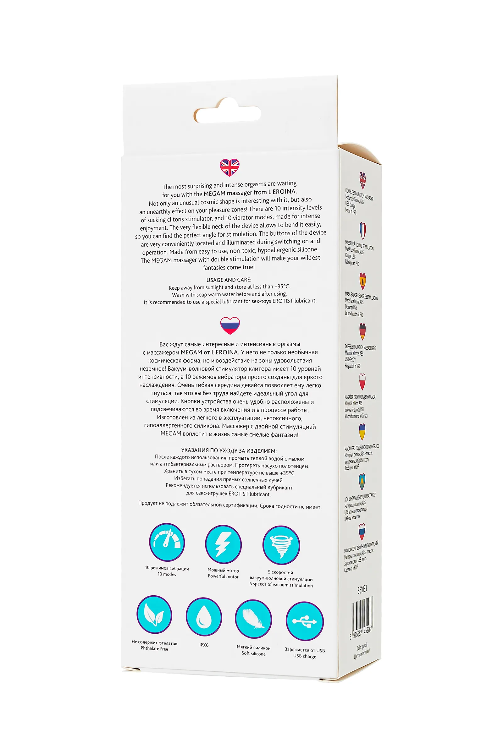 Желаете испытать самые незабываемые и сильные оргазмы? Тогда вибромассажер с вакуумной стимуляцией Megam от бренда L’Eroina - именно то, что вам нужно! Его уникальная космическая форма и эйфорическое воздействие на зоны удовольствия приведут вас к неземным ощущениям. Этот вакуум-волновой стимулятор клитора имеет 10 уровней интенсивности, а 10 режимов погружной вибрирующей части созданы для яркого наслаждения и массажа зоны G. Гибкая середина устройства легко гнется, позволяя вам легко найти идеальный угол для стимуляции. Кнопки Megam расположены удобно на корпусе и подсвечиваются во время использования. Изготовлен массажер из легкого в эксплуатации, нетоксичного и гипоаллергенного силикона. С помощью интимной игрушки Megam и двойной стимуляции, воплотить в жизнь самые смелые фантазии станет легче легкого. Особенности: Мощный мотор 10 скоростей вакуум-волновой стимуляции 10 режимов вибрации Очень гибкий Диаметр погружной части 3,5 см, диаметр вакуумного отверстия 1,5 см Влагостойкость IPX6 (защита от брызг) Мягкий силикон Заряжается от USB (кабель в комплекте)