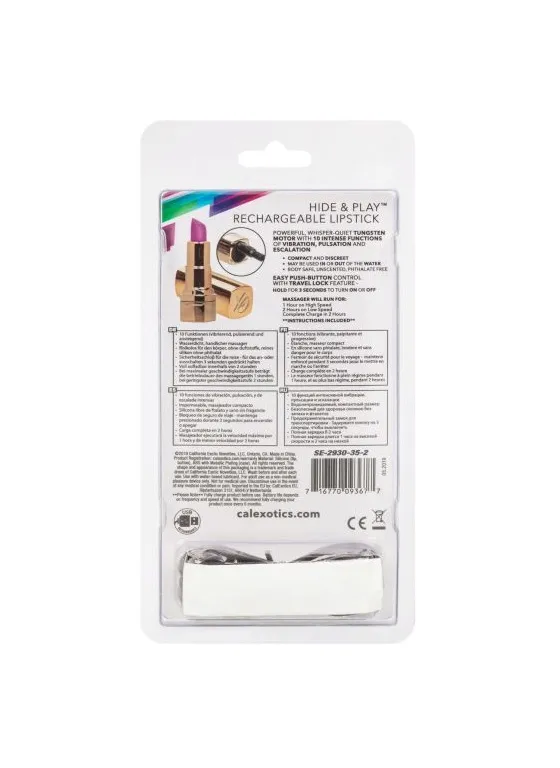 Hide & Play Rechargeable Lipstick – перезаряжаемый мульти скоростной миниатюрный вибромассажер, выполненный в виде помады. Корпус изготовлен из гладкого, не содержащего фталатов АБС-пластика, покрытого золотым полеуретановым покрытием, а головка выполнена из мягкого ультра-плюшевого силикона. Бесшумный двигатель вибратора обеспечивает 10 различных функций вибрации, пульсации и эскалации.