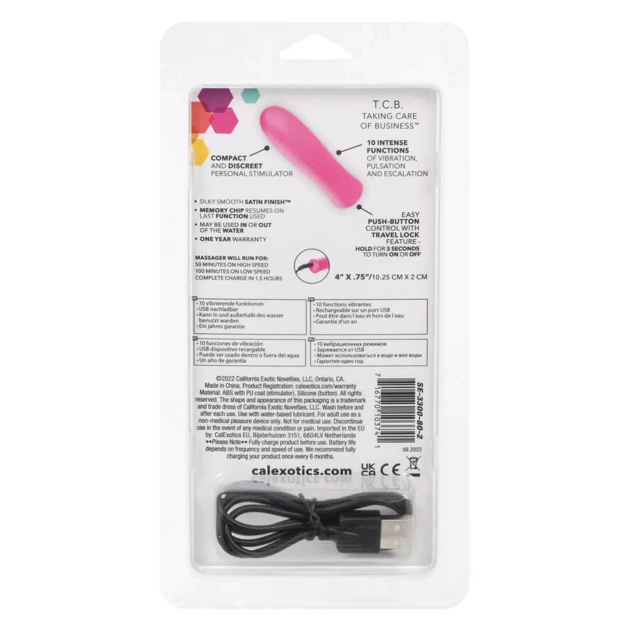 T.C.B. Taking Care of Business- это мощный мини вибратор, который оснащен 10 режимами интенсивной стимуляции и имеет чувственно изогнутый корпус. В игрушке есть высокотехнологичный встроенный чип памяти, который позволяет запомнить последний режим выбранной вибрации и включается именно с него, не требуя снова искать предпочитаемую функцию. А благодаря компактному размеру, этот вибратор будет максимально удобно брать с собой в поездки.