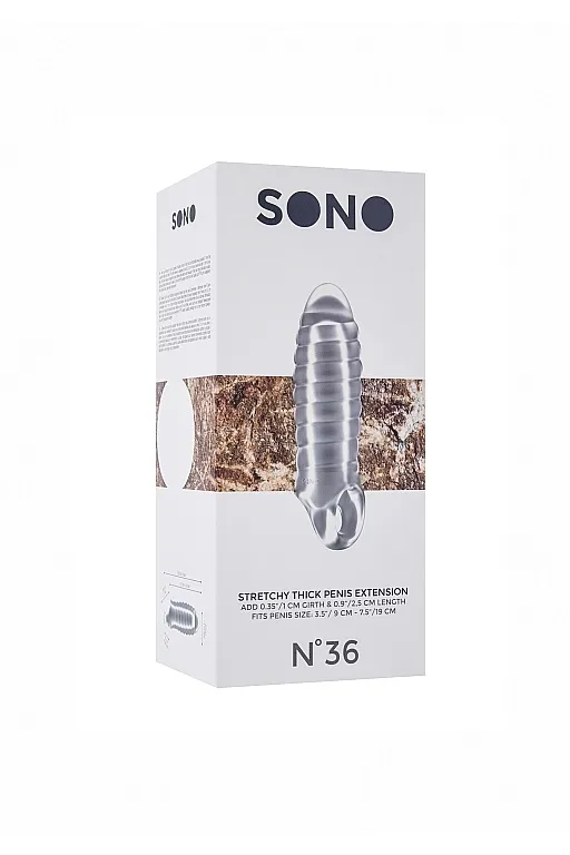 No.36 - Stretchy Thick Penis Extension – насадка закрытого типа для увеличения длины на 2,5 см. и обхвата полового члена на 0,9 см. с кольцом для фиксации на мошонке. Она имеет округлую головку и спиралевидную форму для более оптимальной стимуляции. Насадка произведена из высококачественного мягкого материала.