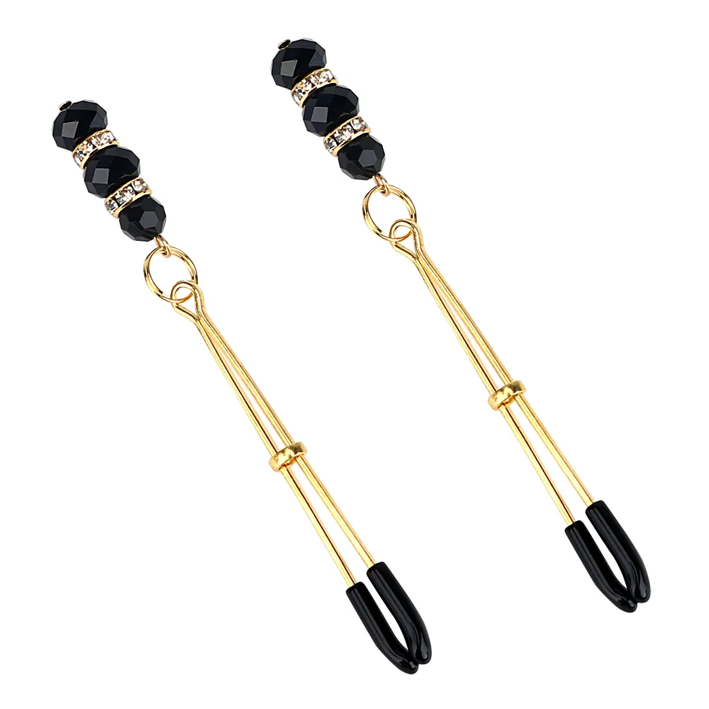 Зажимы на соски с подвеской из бусин и страз служат дополнительным стимулятором одной из самых чувствительных зон. Включают в себя 2 полностью регулируемых многофункциональных зажима. Имеют мягкие наконечники и подвески из бусин и страз, которые одновременно служат украшением и своебразным утяжелителем для дополнительных ощущений.