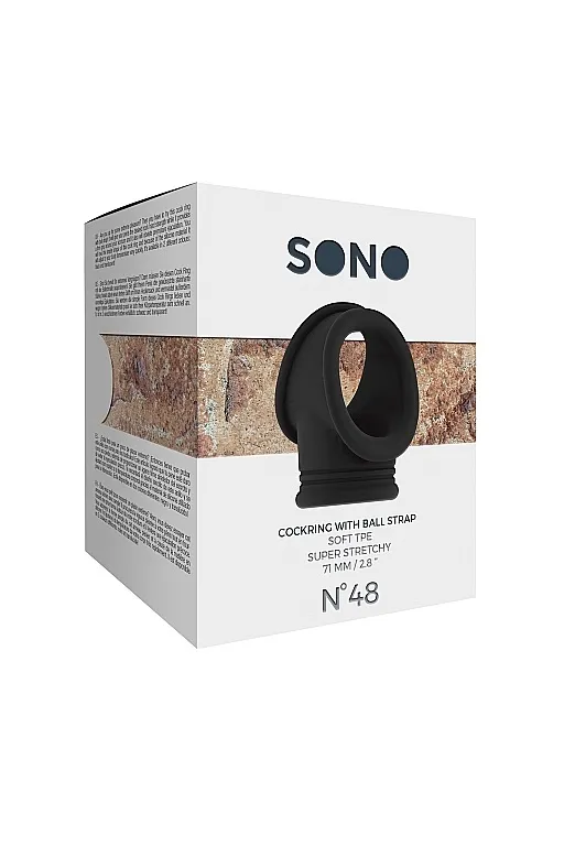 No48 - Cockring with Ball Strap – простое и элегантное эрекционное кольцо для пениса и мошонки, изготовленное из эластичного, легко принимающего температуру тела материала.