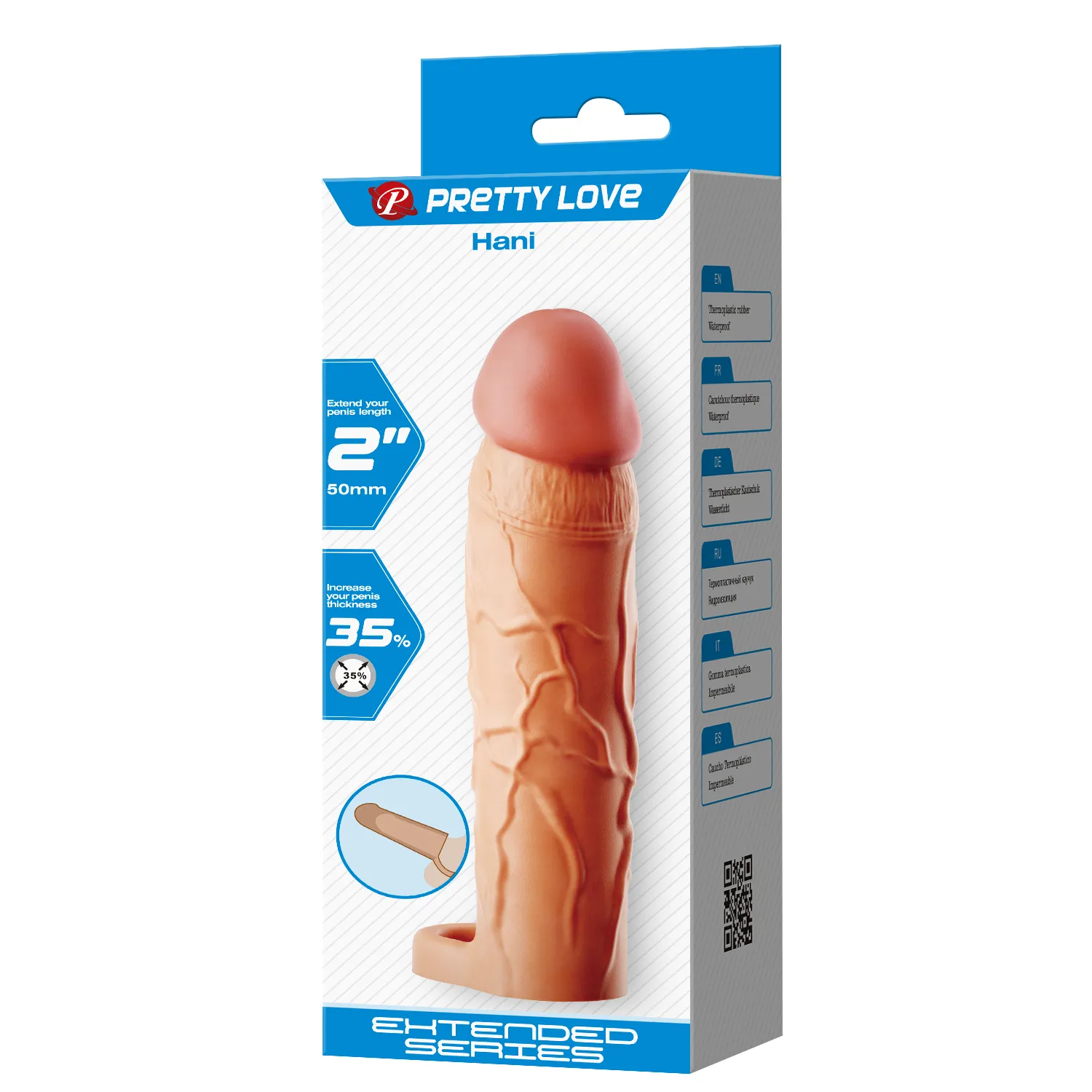 Hani Extended Series от бренда PRETTY LOVE — это насадка на член из материала TPR, предназначенный для увеличения длины и объема пениса. Он добавляет 5 см в длину и 35% в объеме. Текстурированная внешняя поверхность с венами обеспечивает натуральные ощущения, а расширенная головка усиливает контакт. Внутренний гладкий канал плотно охватывает эрекцию для максимального стимулирования. Рукав оснащен кольцом для яичек, которое фиксирует его на месте и помогает продлить эрекцию. Размеры: внешний диаметр 3.9 см, внутренний диаметр 2.3 см, общая длина 18 см. Вес: 120 граммов. Водонепроницаем и легко очищается.