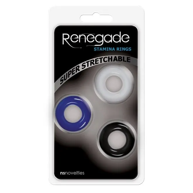 Супер эластичные эрекционные кольца Renegade Stamina Rings от NS Novelties подходят для любого диаметра члена. Можно использовать одно или все три сразу, комбинируйте так чтобы вам было комфортно и продлите удовольствие себе и партнёрше.