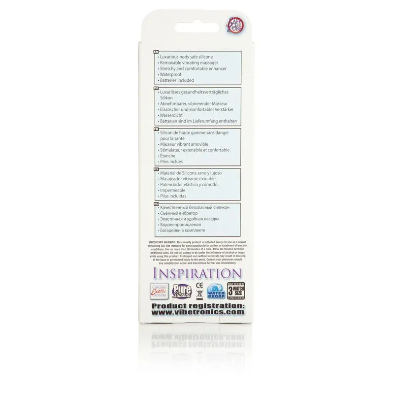 Body & Soul Inspiration - это эластичное и удобное силиконовое колечко с отростком-стимулятором для партнера. Мощный съемный вибратор может использоваться отдельно от колечка. Изделие создано из мягкого и упругого силикона и легко надевается на пенис. Игрушка понравится парам, предпочитающим продолжительные сексуальные контакты и длительные прелюдии. Кольцо с вибропулей из ABS пластика нежно стимулирует эрогенные зоны партнеров. Прибор понятен в управлении с первого раза и не требует особого ухода после эксплуатации. Размер вибропули: 4.5 х 1.25 см.