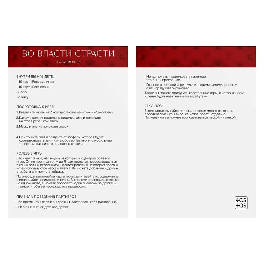 А ещё вас ждут карточки с горячими позами, которые можно включить в эротические игры либо же использовать отдельно. По желанию вы можете воспользоваться маской и плёткой. По очереди вытягивайте карточки, зачитывайте описание позы и смотрите на картинку. Вот и всё, осталось только воплотить её в жизнь!