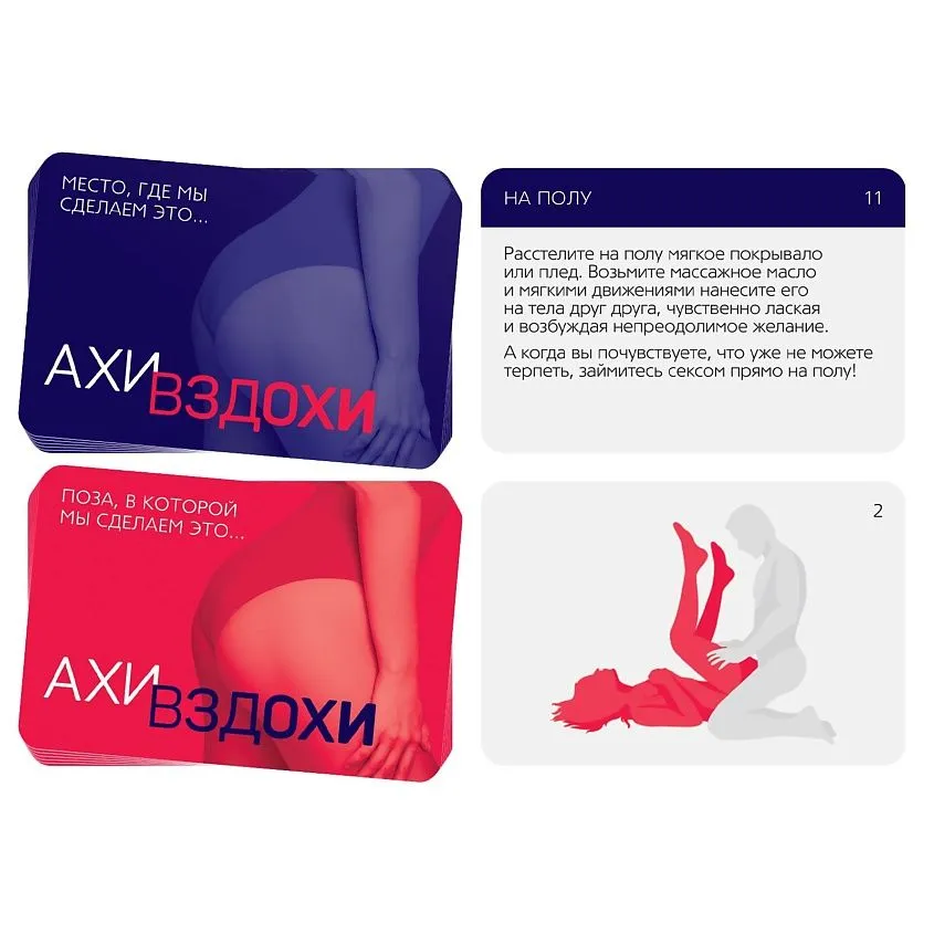 «Ахи-вздохи» — это серия эротических игр для двоих, которая включает невероятное множество пикантных заданий-фантов для него и для неё. Здесь найдутся игры в формате вопрос-ответ, ролевые развлечения и необычные позы для секса. Игры серии «Ахи-вздохи» подойдут для тех, кто только начал романтические отношения и хочет узнать друг друга поближе, а также для пар, союз которых длится уже долго.