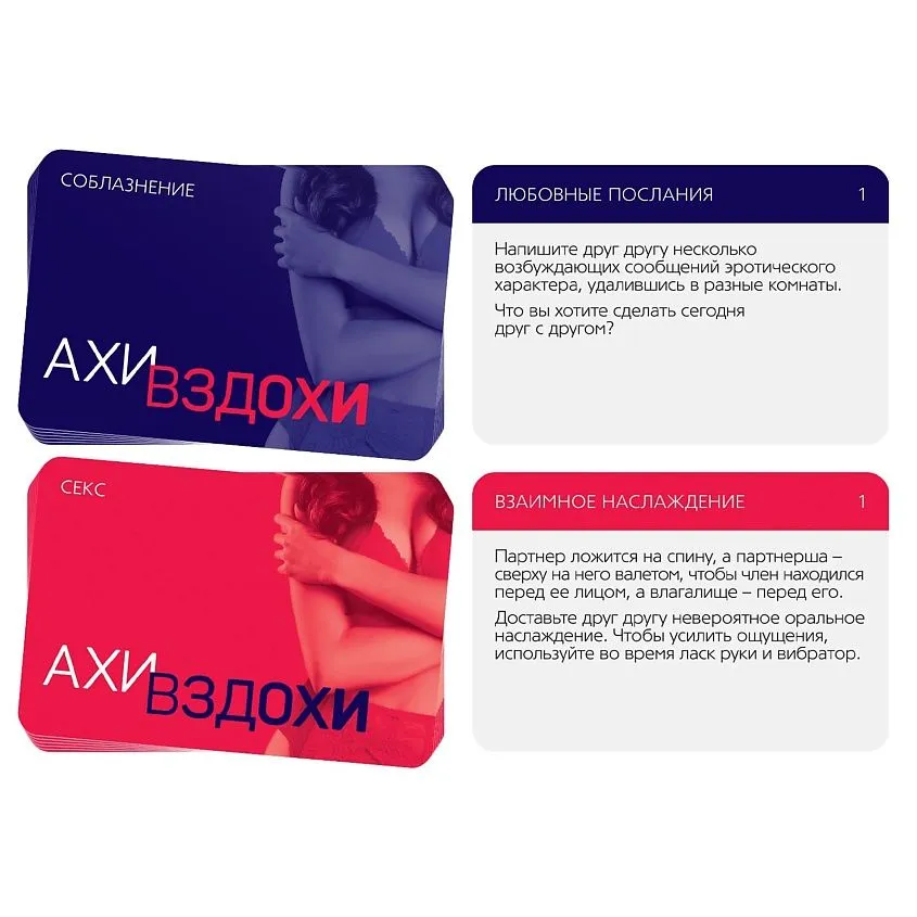 «Ахи-вздохи» — это серия эротических игр для двоих, которая включает невероятное множество пикантных заданий-фантов для него и для неё. Здесь найдутся игры в формате вопрос-ответ, ролевые развлечения и необычные позы для секса. Игры серии «Ахи-вздохи» подойдут для тех, кто только начал романтические отношения и хочет узнать друг друга поближе, а также для пар, союз которых длится уже долго.