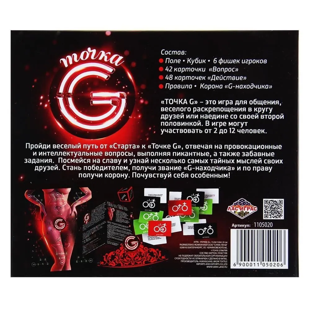 Поспешите, чтобы достичь точки G первым и получить почетное право носить корону «G-находчика»! Игра для больших и веселых компаний "Точка G" от компании Сима Ленд не позволит Вас заскучать. Кидайте кубик, чтобы передвигаться по полю, отвечайте на самые пикантные вопросы и слушайте ответы друзей, а также выполняйте задания. Задания и вопросы поделены на 3 уровня сложности, определить который можно по цвету карточки. Сейчас вы отвечаете на пикантный вопрос, а в следующий раз придётся выполнить задания. С каждым ходом вопросы и задания становятся всё интересней. Преодолевая все препятствия на пути к цели, узнайте, кто же в итоге будет обладать званием «G-находчика».