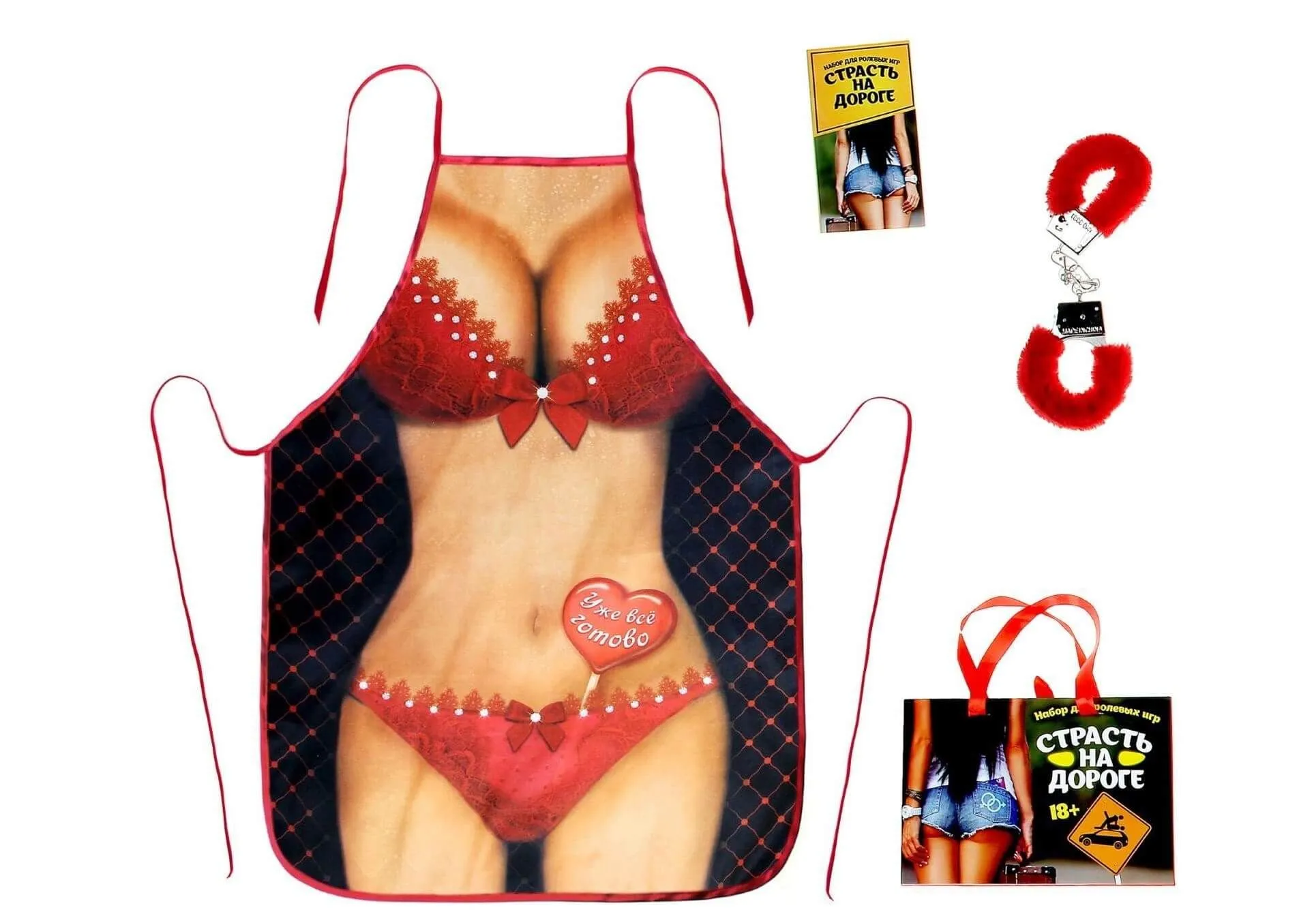 В наборе: фартук, наручники, листовка с играми.