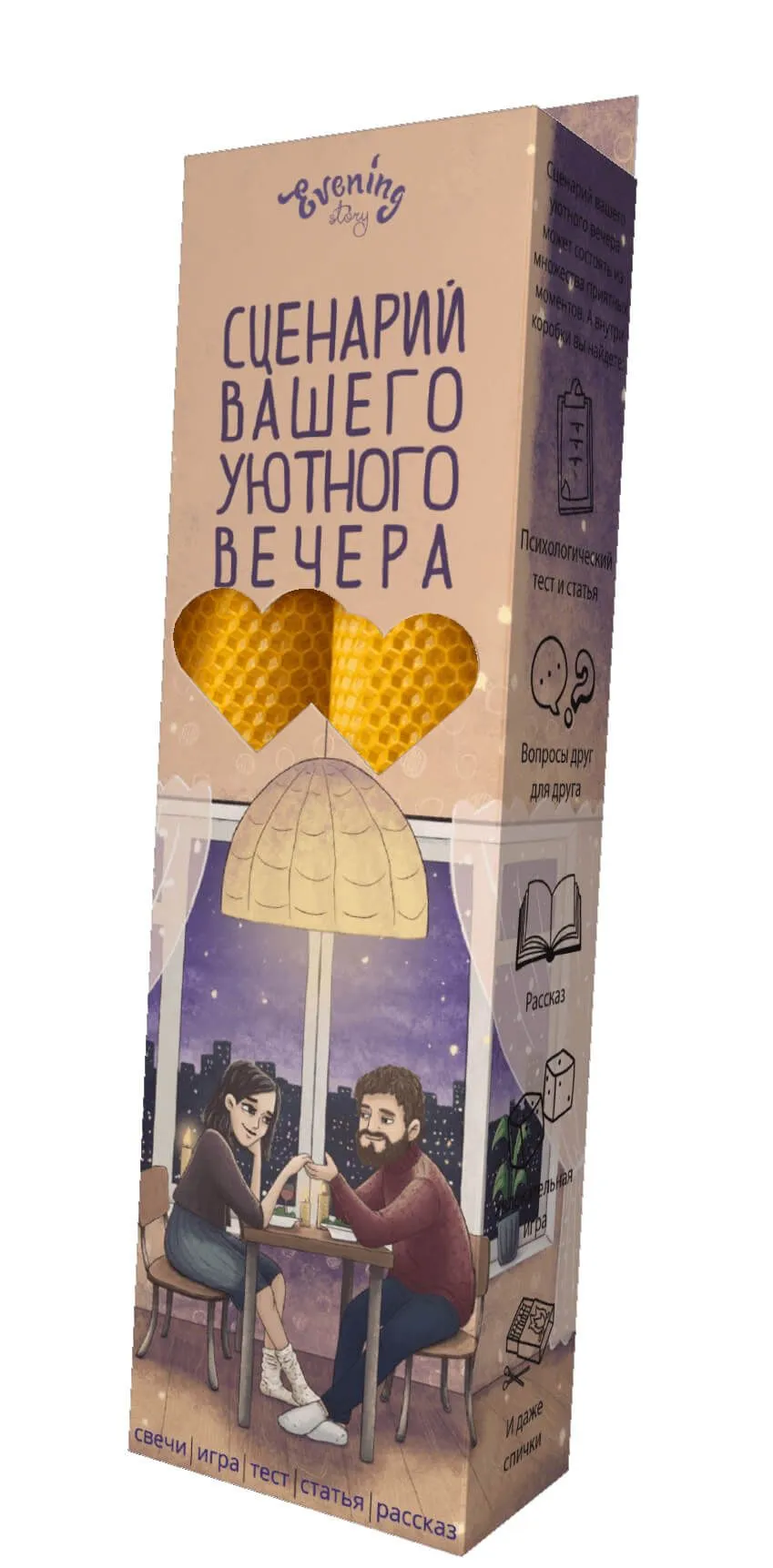 Набор "Сценарий вашего уютного вечера" от Evening Story это легкий способ для пары провести уникальное и запоминающееся свидание. Данный сценарий, за 2 часа, поможет вам сблизится и лучше узнать друг друга. А так же найти в партнёре что-то новое, даже если вам кажется, что вы уже знаете абсолютно всё.