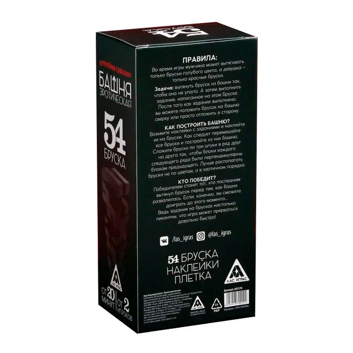 Игра строго 18+! Наклейте наклейки на бруски. Постройте из брусочков башню, складывая из по три на одном «этаже». У вас должно получиться 18 этажей. Вытягивайте очереди брусочки и выполняйте то, что на них написано. Мужчина вытягивает голубые, женщина красные. Выигрывает тот, кто последним вытянул брусок перед тем, как башня упала. Если, конечно, вы сможете не забыть об игре, потому что задания очень горячие!