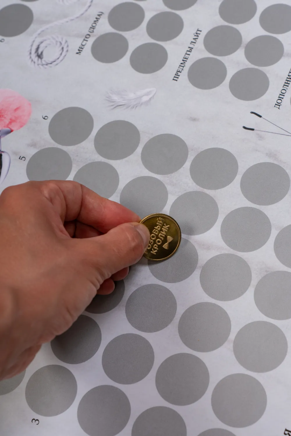В комплекте: игровое после формата А2, медиатор для удаления скрэтч-слоя, пара игральных кубиков, тубус для хранения.