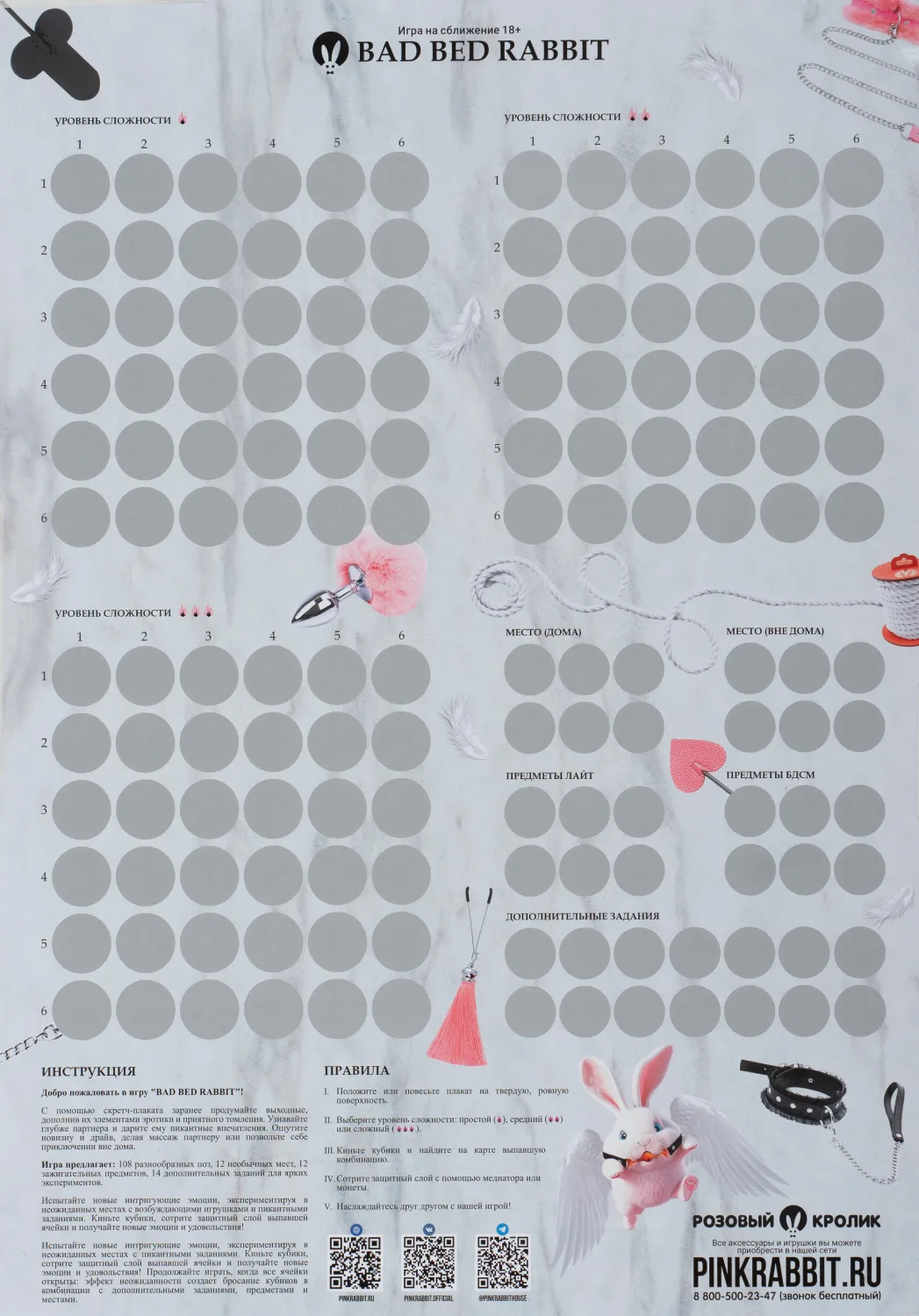 Чувственная настольная игра Bad Bed Rabbit от Pink Rabbit – игра для партнёров на сближение. Позвольте страсти и случаю решить, как именно вы сегодня будете любить друг друга. Создайте антураж, зажгите ароматические свечи, не забудьте массажное масло с волнующим ароматом и любимый лубрикант.. И начинайте игру!