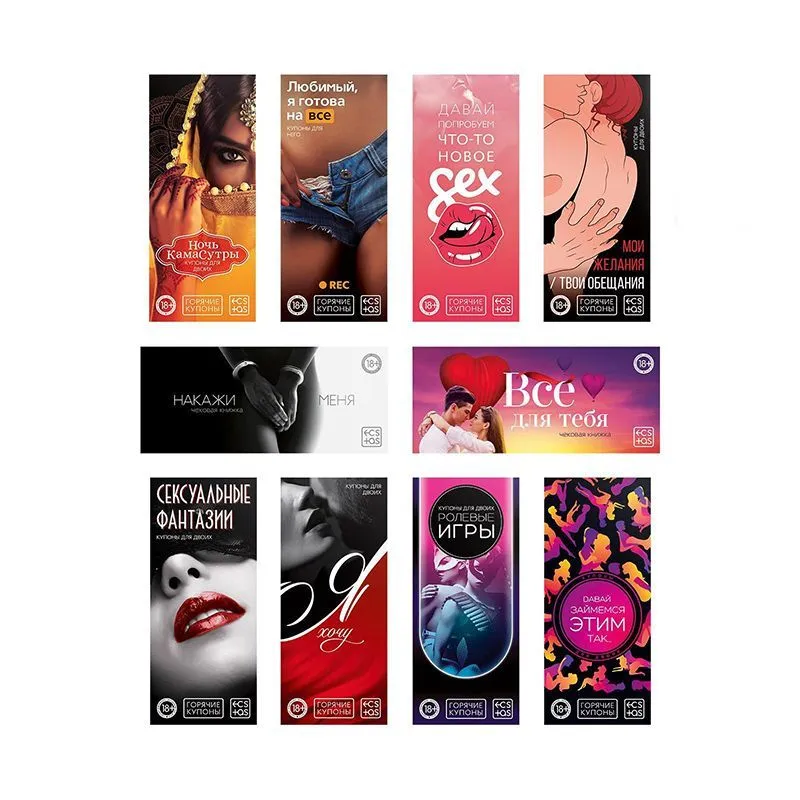 Выберите вид купонов, которые будете использовать сегодня. Хотите попробовать новую ролевую игру? Или исполнить эротическое желание своей половинки? Смело вручайте выбранный купон и получайте наслаждение. В каждом виде купонов вас ждёт 20 заданий для него и для неё. Купоны можно аккуратно разрезать и вручать нужный.
