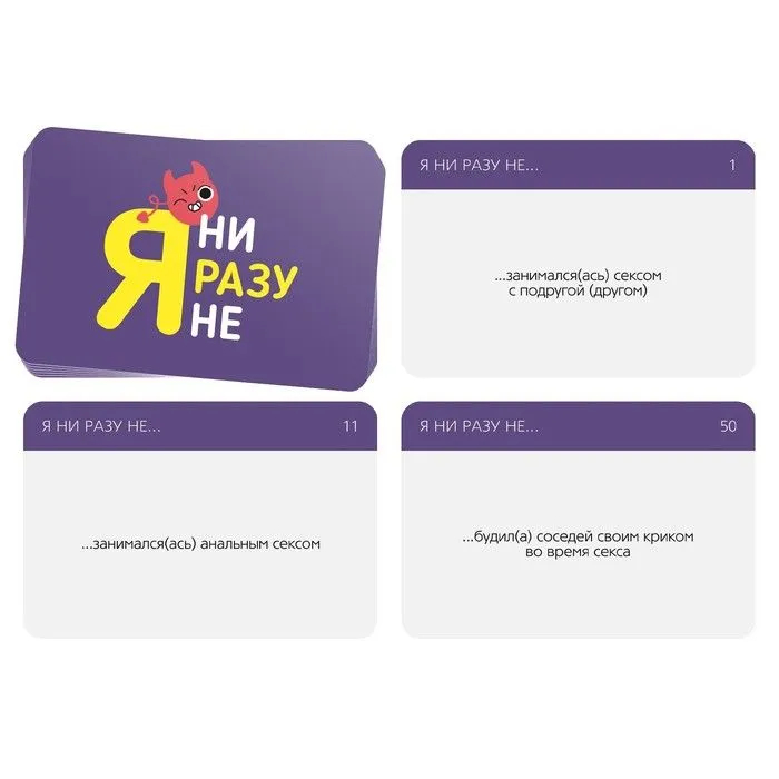 Тебя ждет 50 карточек с утверждениями, каждое из которых начинается с фразы: «Я ни разу не…» Игроки вытягивают их по одной и зачитывают. А каждый, кто хоть раз совершал указанное действие, должен выполнить наказание, а какое именно – решает ваша компания!