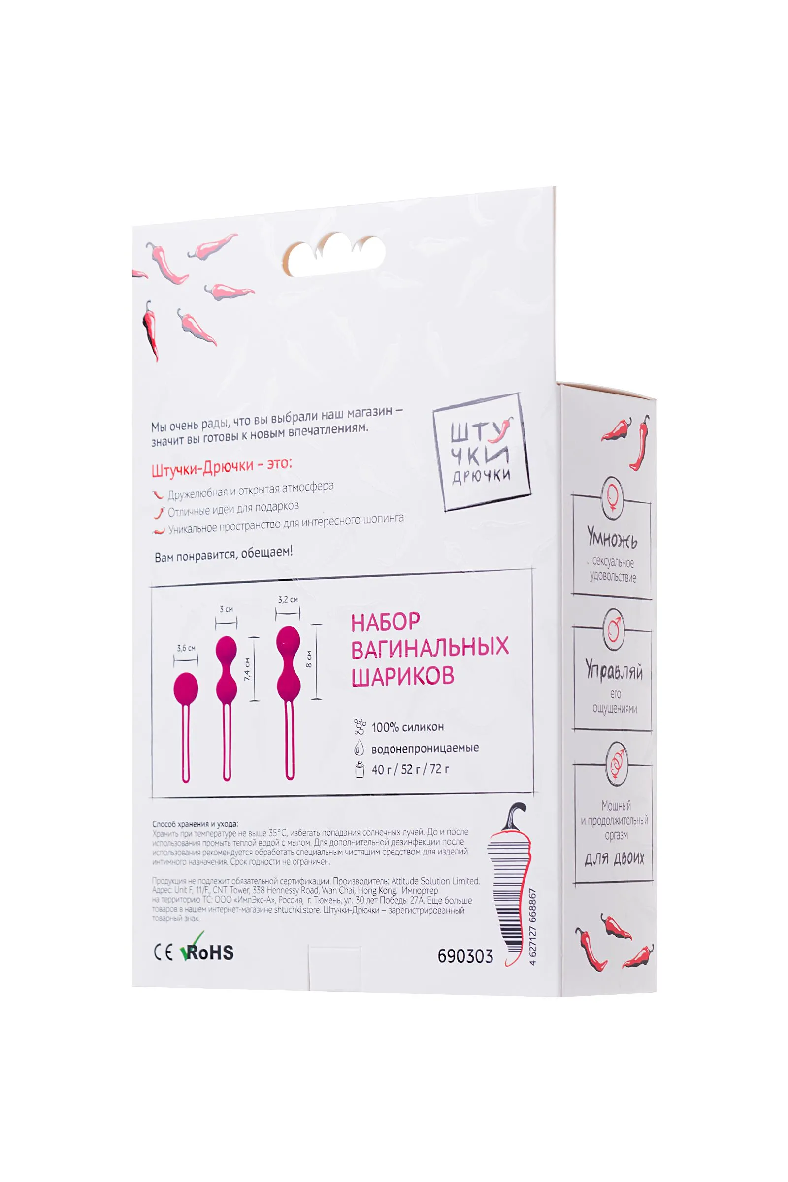 Набор вагинальных шариков "Штучки-Дрючки" со смещенным центром тяжести выполнен из нетоксичного и гипоаллергенного 100% силикона высокого качества. На конце есть петля, позволяющая легко вводить и извлекать игрушку. Водонепроницаемы и просты в уходе. Идеальный способ попрактиковать упражнения Кегеля. Благодаря шарикам разной тяжести вы можете начать тренировки, даже если никогда этого не делали, постепенно увеличивая нагрузку. Вагинальные шарики "Штучки-Дрючки" укрепляют ЛК-мышцы, улучшают тонус и упругость мышц влагалища, а также помогают увеличить продолжительность и интенсивность оргазмов. Просто нанесите ваш любимый лубрикант и вставьте шарики. Они абсолютно бесшумны, а петлю для извлечения легко спрятать в нижнем белье. Рекомендуется использовать игрушку не более 2 часов, начиная с 20-30 минут ежедневно. Размеры: длина - 16,5 диаметр - 3,2; длина - 15,5 диаметр - 3; длина - 12 диаметр - 3,6