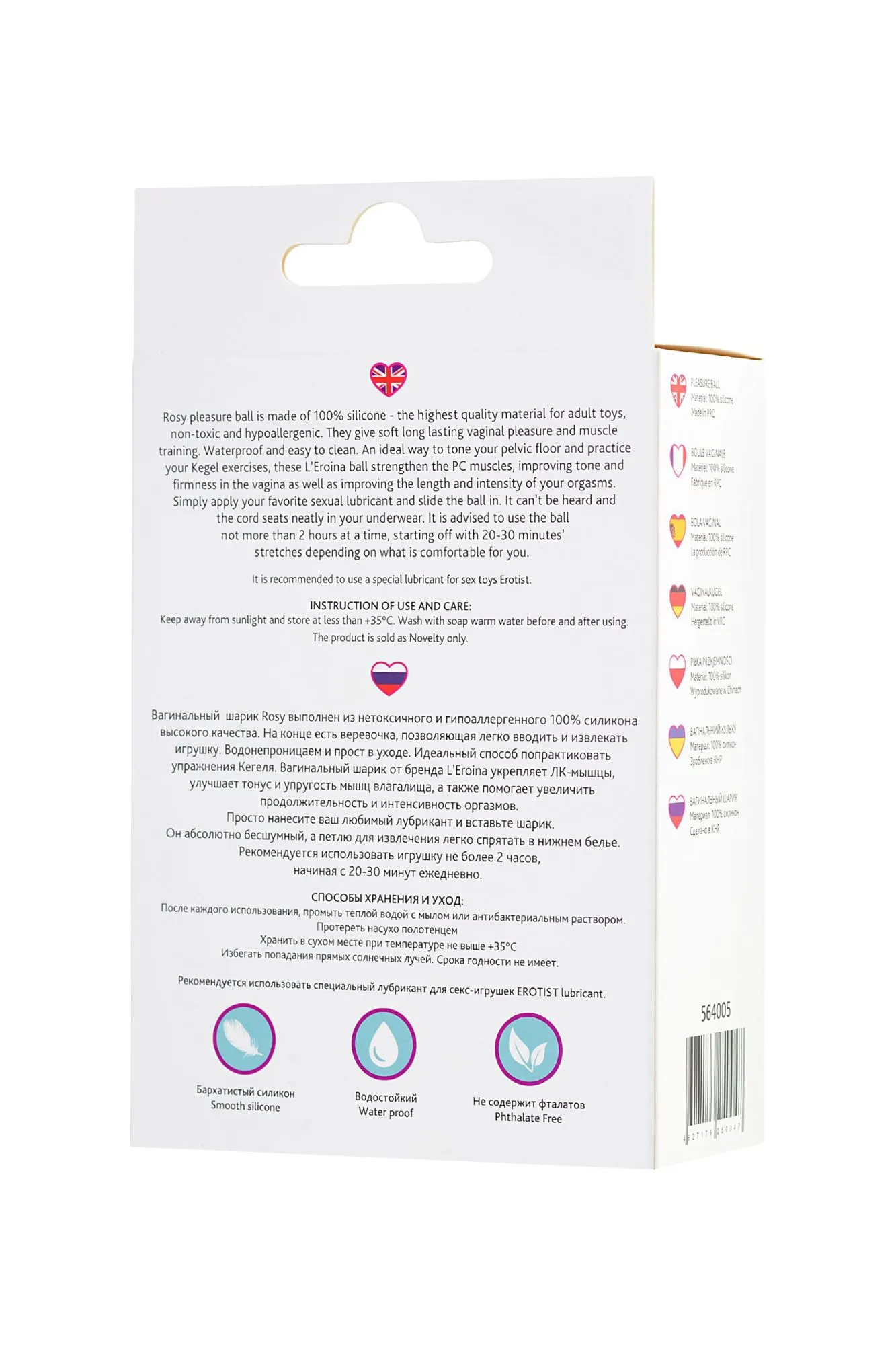 Вагинальный шарик Rosy выполнен из нетоксичного и гипоаллергенного 100% силикона высокого качества. На конце есть веревочка, позволяющая легко вводить и извлекать игрушку. Водонепроницаем и прост в уходе. Идеальный способ попрактиковать упражнения Кегеля. Вагинальный шарик от бренда L’Eroina укрепляет ЛК-мышцы, улучшает тонус и упругость мышц влагалища, а также помогает увеличить продолжительность и интенсивность оргазмов. Просто нанесите ваш любимый лубрикант и вставьте шарик. Он абсолютно бесшумный, а петлю для извлечения легко спрятать в нижнем белье. Общий длина: 10,5 см Диаметр: 3,1 см Вес: 50 гр.