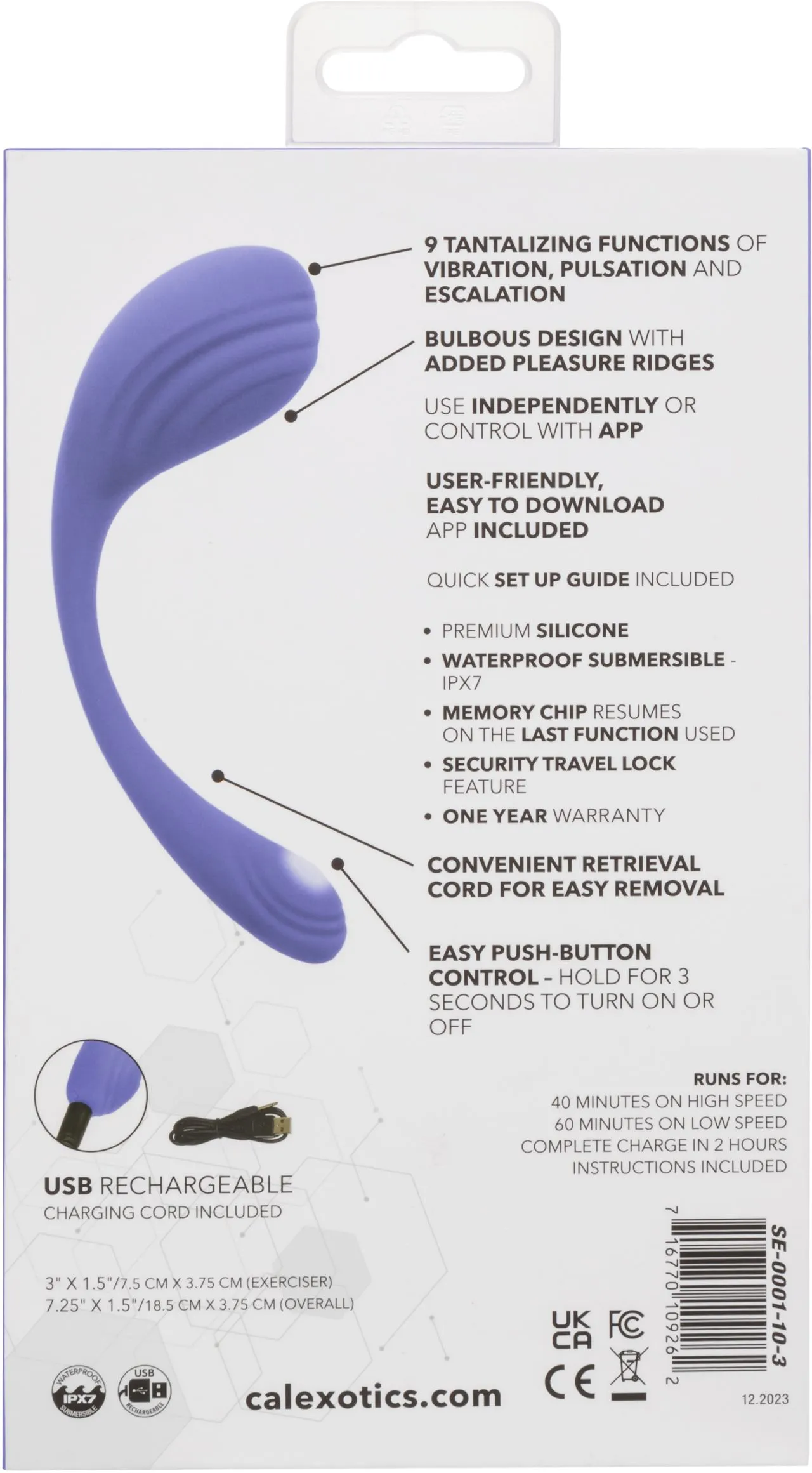 Приоритет вашего удовольствия, тренажер Кегеля изготовлен из безопасного для тела силикона и на 100% водонепроницаем с рейтингом IPX7, что делает его безопасным для использования в различных условиях. Современный чип памяти возобновляет работу с последней использованной функцией, обеспечивая непрерывное удовольствие. Функция блокировки безопасности во время путешествий, активируемая трехсекундным удержанием, гарантирует конфиденциальность. Этот тренажер Кегеля, заряжаемый через USB с помощью прилагаемого зарядного кабеля, обеспечивает полную зарядку всего за 2 часа, с 40 минутами использования на высокой скорости или 60 минут на более низких настройках. Поднимите свое удовольствие на новый уровень с тренажером Кегеля CalExotics Connect.