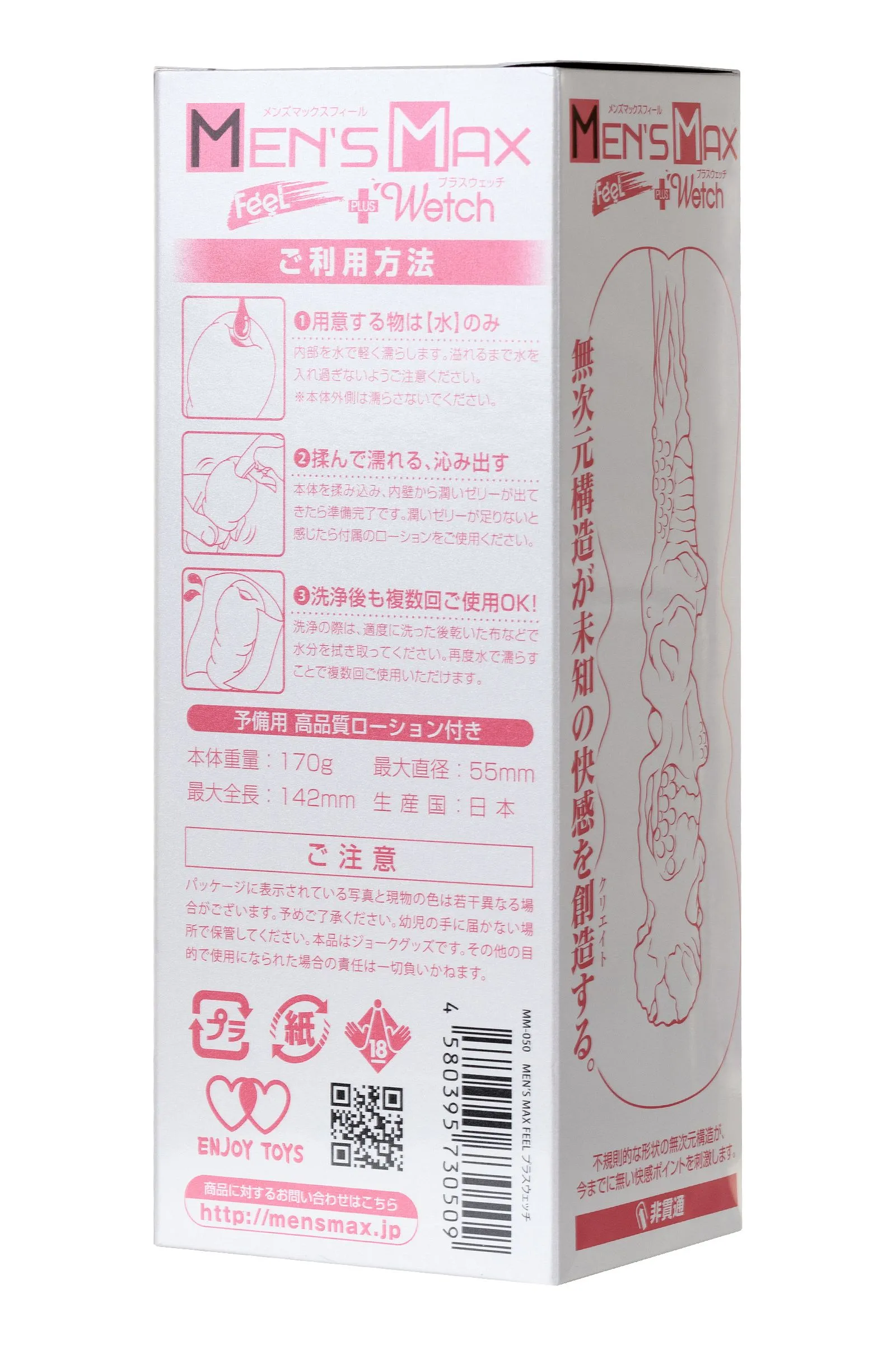 Man`s Max Feel + Wetch — это мастурбаторы, которые перевернут ваше представление об игрушках из эластомера. Нежнейшие ласки, воздушная текстура и потрясающие ощущения — то, что может дать вам только Feel. Благодаря уникальной технологии Plus Wetch вам больше не нужен лубрикант! Влейте немного воды внутрь игрушки — и бархатная поверхность сама выделит смазку. Вам останется только распределить её внутри мастурбатора и получать удовольствие от долгих умелых ласк! Внутренняя поверхность имеет сложную структуру. Снаружи корпус выполнен так, чтобы его удобно было держать в руке. Внутренняя же поверхность имитирует текстуру живых тканей: на выпуклости и углубления различной формы дарят непередаваемые ощущения при проникновении! Нежный эластомер Clear Skin имитирует женскую кожу и прекрасно тянется, при этом материал прочен, долговечен и безопасен. Откройте для себя самую комфортную и возбуждающую эротическую игру вместе с Feel + Wetch!