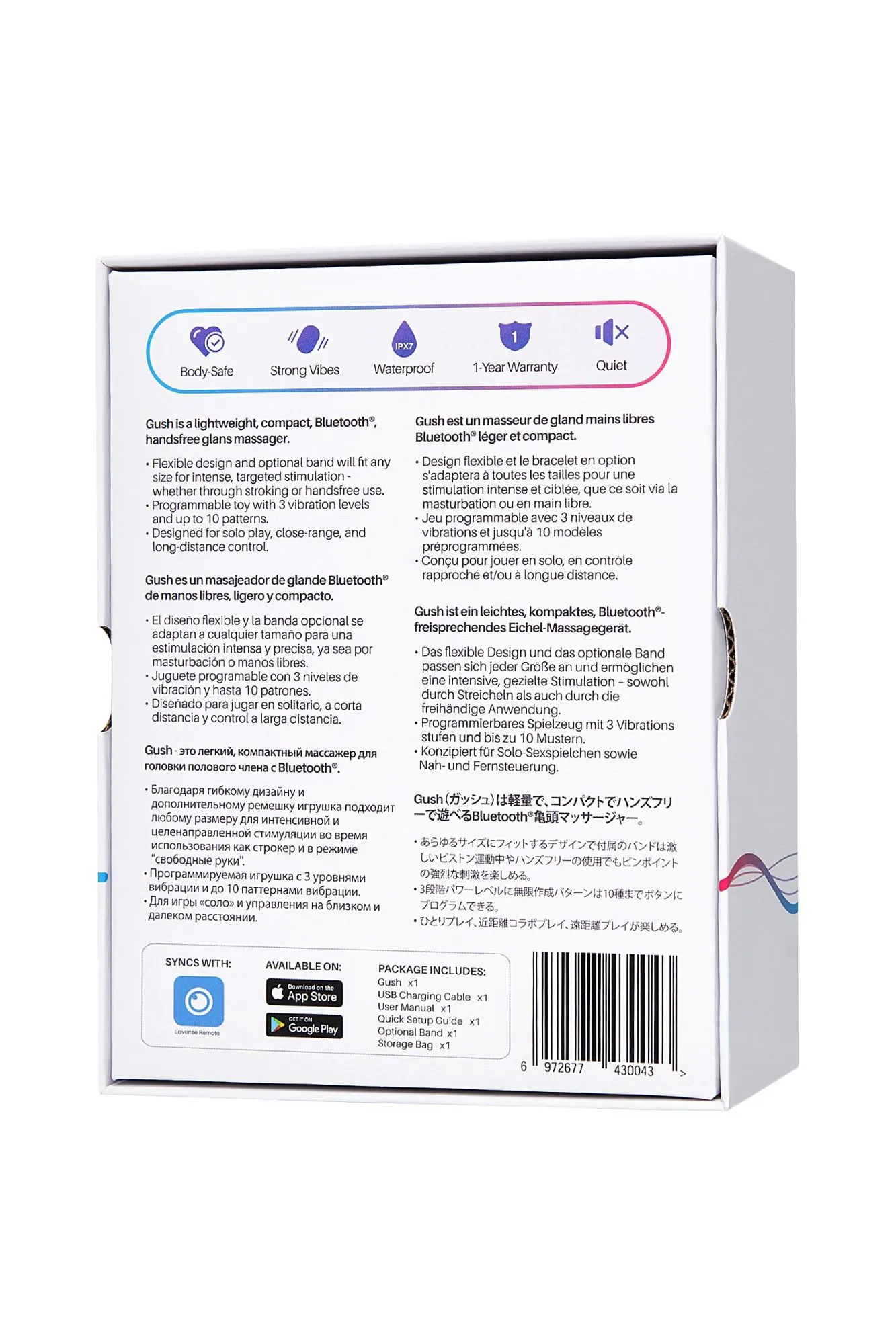 Lovense Gush - это портативный вибромассажер для мужчин. Уникальный девайс с функцией вибростимуляции создан для получения новых ощущений от массажа головки пениса. Благодаря гибким силиконовым лепесткам и съемному ремешку, массажер подойдет для любого размера полового члена. Дизайн позволяет прочно удерживать игрушку в ладони и самостоятельно регулировать плотность прилегания и интенсивность стимуляции. Кроме того, водонепроницаемый Lovense Gush обладает мощным мотором. С помощью кнопок на панели доступно переключение режимов - 3 скорости и 4 вибро ритмов, что позволяет создать многообразие вариантов вибрации по вашему предпочтению. Также Lovense Gush существенно расширяет возможность получения удовольствия с помощью приложения Lovense Remote. Благодаря инновационным технологиям беспроводного подключения по Bluetooth у вас неограниченное количество всевозможных паттернов вибрации - создайте собственный ритм, реагирующий на голос или любимую музыку. Используйте Lovense Gush вместе с партнером, даже находясь в разных городах, управляйте своим удовольствием прямо со смартфона. Для безопасного и комфортного получения удовольствия рекомендуется использовать с лубрикантами на водной основе. высококачественный безопасный силикон заряжается магнитным USB-кабелем в комплекте мешочек для хранения время работы 90 минут время зарядки 60 минут водонепроницаемость IPX7