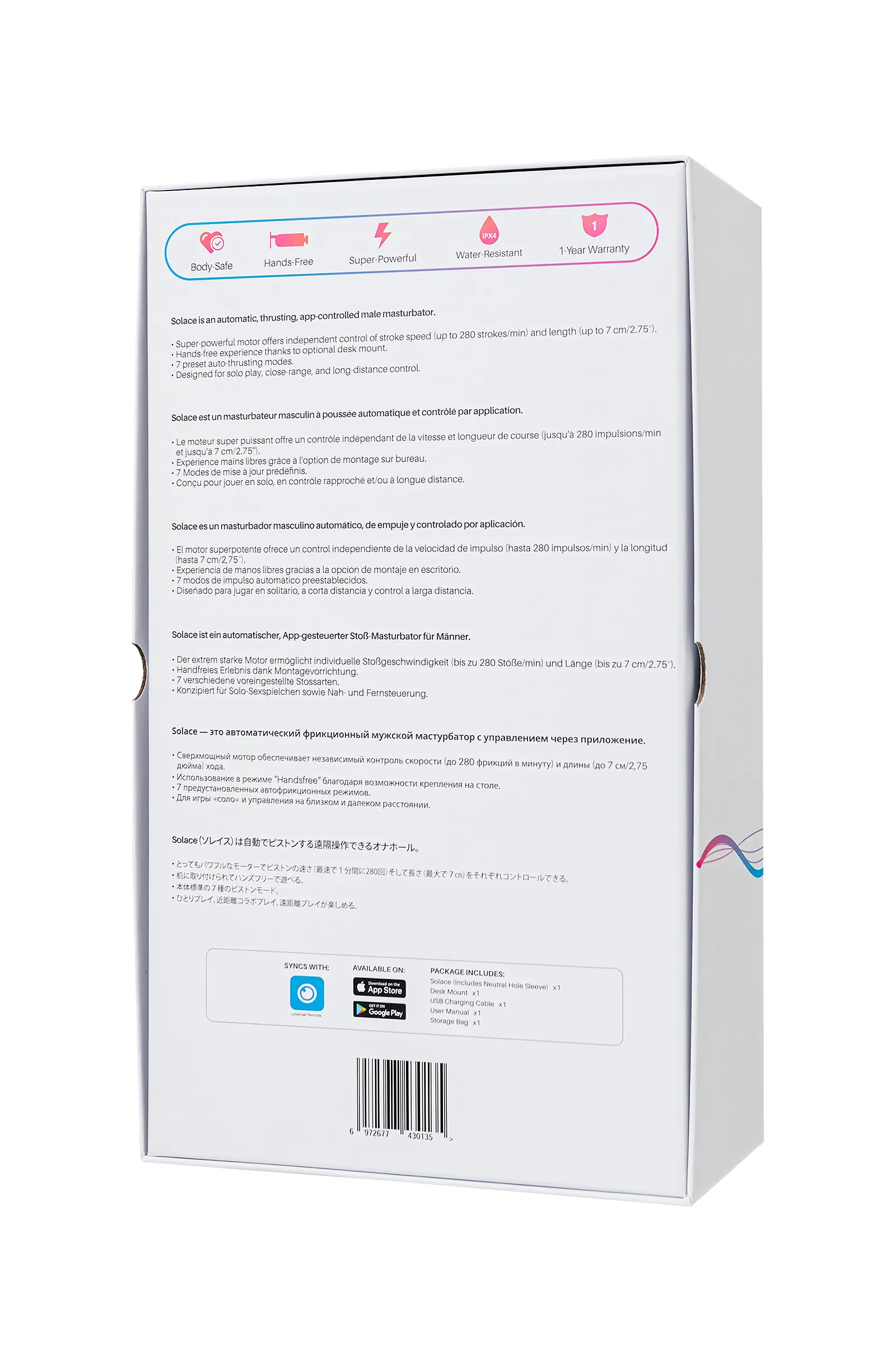Вы готовы возвести вашу мастурбацию на новый уровень? Solace от Lovense – инновационный автоматический фрикционный мужской мастурбатор, который сделает “это” за тебя. Для этой игрушки не важен опыт и наличие партнера – соло игра, секс с партнером на расстоянии или виртуальная реальность – возможно все! С этой умной игрушкой у вас есть возможность настроить мастурбацию в зависимости от настроения, предпочтений и ситуации. От чувственной и неторопливой, до интенсивной и агрессивной. Этот мощный мастурбатор способен достигать до 280 ударов в минуту с настраиваемой глубиной хода до 7 см. Испытайте полное погружение в виртуальную реальность. Синхронизация с видео, играми, стримами и другими игрушками позволит существенно расширить грани удовольствия. Solace соответствует движениям стримера или персонажа в игре, в то время пока вы просто получаете удовольствие. Устойчивое настольное крепление удерживает Solace на месте и регулируется в пределах 180° в зависимости от того, как вы хотите играть – сидя за компьютером или стоя за столом. Мастурбатор легко использовать и без крепления – на диване, лежа в кровати или передав устройство партнеру. Управление простое и интуитивно понятное. Предустановленные 7 режимов переключаются кнопками на корпусе, а через приложение Lovense Remote вы можете создавать индивидуальные настройки. Solace предлагает неограниченное количество паттернов фрикций, регулируемые уровни скоростей и режимов, а также возможность игры в режиме Handsfree. Передайте контроль над Solace звуку, музыке или своему партнеру, создавая интенсивность и продолжительность фрикций по вашему вкусу. Lovense не терпит ограничений в удовольствии. Для вас предусмотрено неограниченное количество возможностей в соло режиме или даже находясь на большом расстоянии от партнера. В комплекте эластичный рукав с внутренней текстурой, созданной для того, чтобы тесно облегать пенис и усиливать каждое ощущение. Нейтральный рукав мягкий и гладкий, с ощущением настоящей кожи. Имеет выступы для дополнительной стимуляции и подходит большинству мужчин. Рукав легко снимать и устанавливать после очистки благодаря откидному держателю. Внимание, мастурбатор Solace не предназначен для игр в воде. Очистке подлежит только внутренний съемный рукав. Автоматические фрикции до 280 ударов в минуту Не водонепроницаемый (!) Работает с приложением Lovense Remote Удовольствие в режиме Handsfree Длина мастурбатора - 29,4 см, диаметр - 10 см. Длина внутреннего рукава - 15,4 см, диаметр - 2,5 см Время использования - до 12,5 часов, время зарядки - до 2 часов Что в комплекте: Автоматический мастурбатор Solace USB Кабель для подзарядки Нейтральный рукав Настольное крепление Руководство пользователя Сумка для хранения