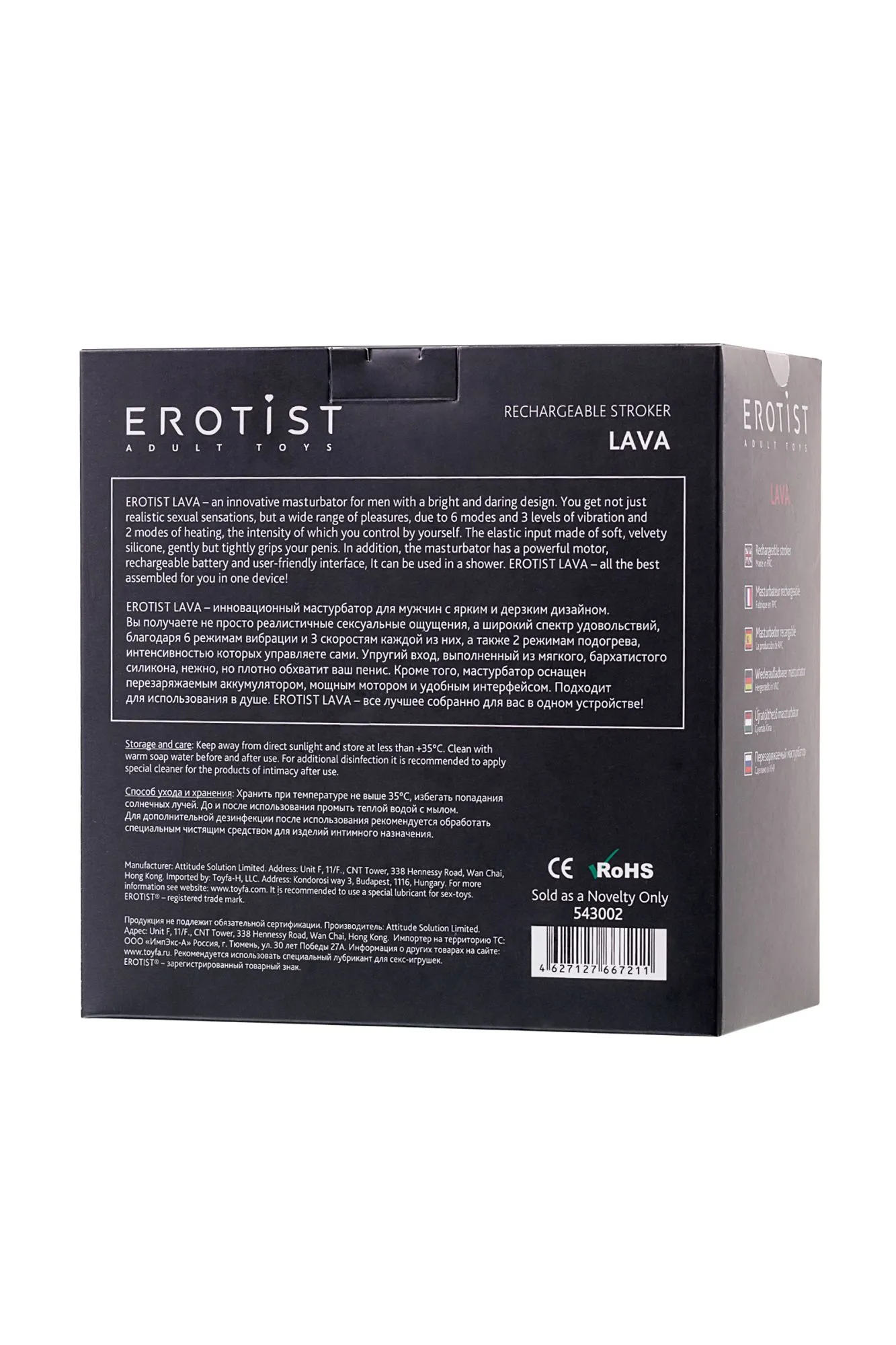 EROTIST LAVA - инновационный мастурбатор для мужчин с ярким и дерзким дизайном. Отличительная особенность устройства – внутренняя поверхность не копирует женское влагалище, однако превосходит его по своим характеристикам. Вы получаете не просто реалистичные сексуальные ощущения, а широкий спектр удовольствий, благодаря 6 режимам вибрации и 3 скоростям каждой из них, а также 2 режимам подогрева, интенсивностью которых управляете сами. Упругий вход, выполненный из мягкого, бархатистого силикона, нежно, но плотно обхватит головку пениса. Кроме того, мастурбатор оснащен перезаряжаемым аккумулятором, мощным мотором и удобным интерфейсом. Подходит для использования в душе. EROTIST LAVA - все лучшее собранно для вас в одном устройстве!
