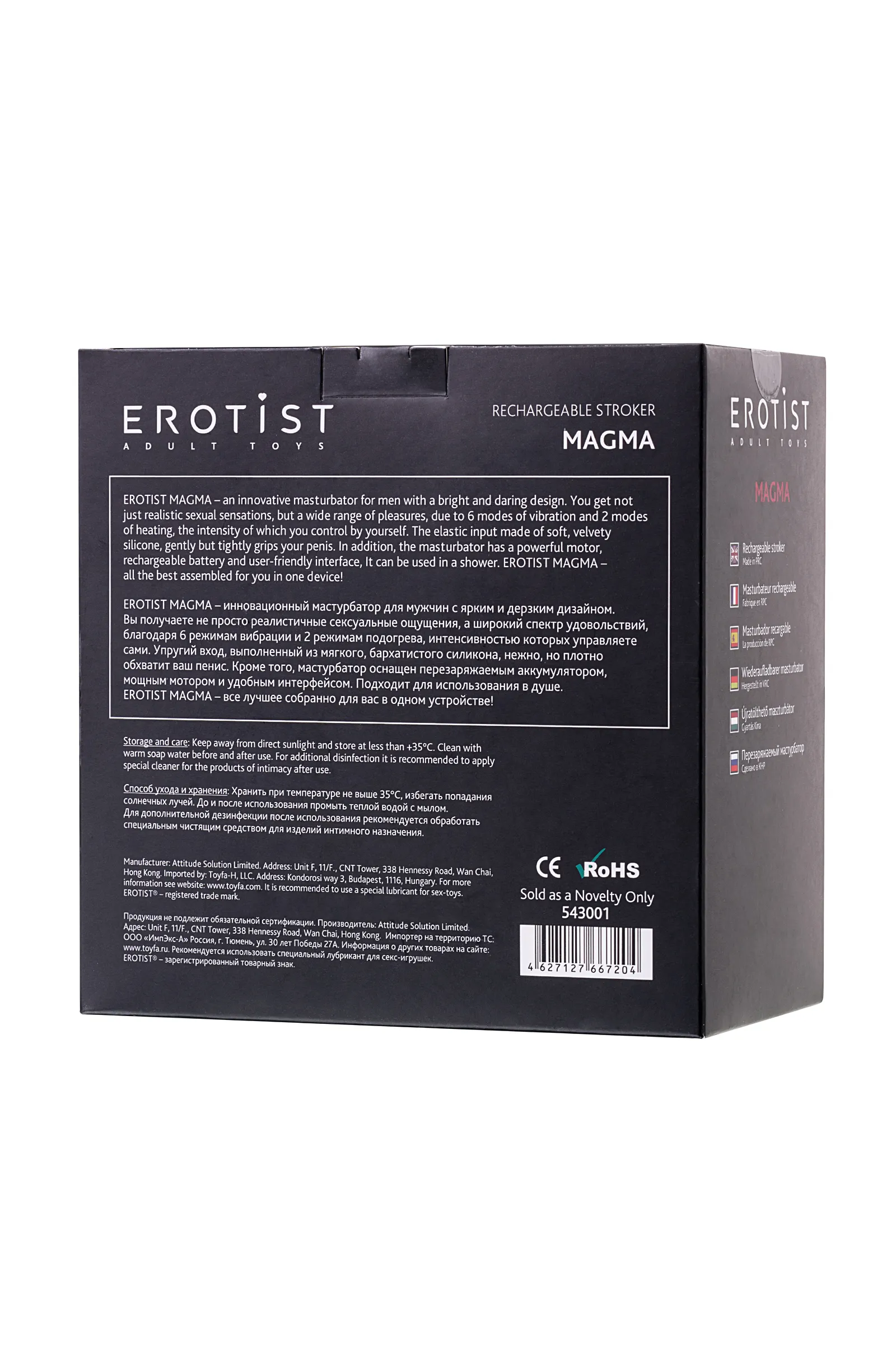 EROTIST MAGMA - инновационный мастурбатор для мужчин с ярким и дерзким дизайном. Отличительная особенность устройства – внутренняя поверхность не копирует женское влагалище, однако превосходит его по своим характеристикам. Вы получаете не просто реалистичные сексуальные ощущения, а широкий спектр удовольствий, благодаря 6 режимам вибрации и 2 режимам подогрева, интенсивностью которых управляете сами. Упругий вход, выполненный из мягкого, бархатистого силикона, нежно, но плотно обхватит головку пениса. Кроме того, мастурбатор оснащен перезаряжаемым аккумулятором, мощным мотором и удобным интерфейсом. Подходит для использования в душе. EROTIST MAGMA - все лучшее собранно для вас в одном устройстве!