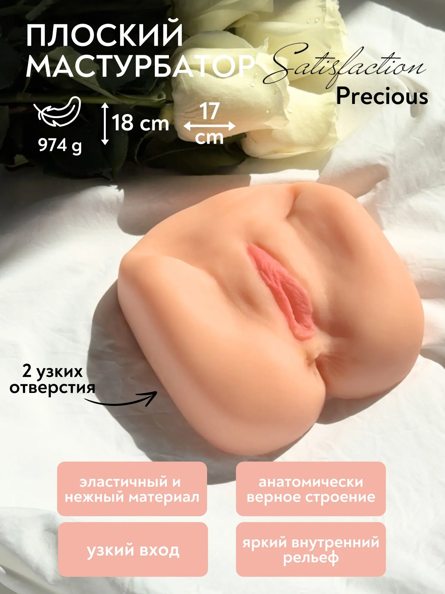 Большой реалистичный мастурбатор выполненный по форме и размеру женщины, имеет два текстурных отверстия. Они с легкостью передают ощущения как от секса с настоящей девушкой. Бархатистый и эластичный материал напоминает нежную женскую кожу. Благодаря плоскому основанию, его можно разместить на любой поверхности. Безопасный для кожи материал не содержит фталатов. Хорошо тянется и подходит для любого размера. Характеристики: длина - 18 см, ширина - 17 см, высота -6см. Материал- TPR.