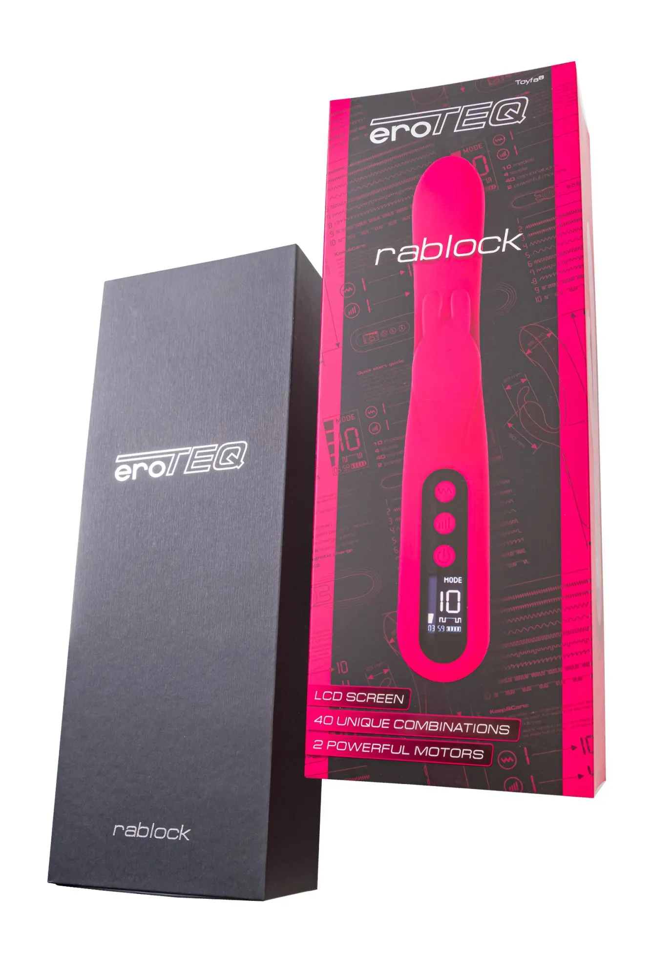 Традиционный вибратор-кролик Rablock от eroTEQ создан с заботой об интимном благополучии. Два мощных мотора, работающих вместе, обеспечивают бескомпромиссную эротическую стимуляцию. Кролик запрограммирован 10 режимами вибрации и 4 уровнями мощности. Сочетая эти параметры легко найти идеальный вибрационный рисунок – 40 уникальных комбинаций, чтобы подарить вам максимум удовольствия и неповторимый оргазм. Погружная часть вибратора обладает естественным изгибом и выразительной головкой, созданной для максимальной стимуляции зоны G. Рабочая длина вагинального отростка в 12,5 см и диаметр в 3,5 см обеспечивают идеальное попадание в центр вашего удовольствия с двух сторон одновременно! Клиторальный отросток с двумя ушками имеет прямой контакт с клиторальной зоной и позволяет экспериментировать легкими дразнящими прикосновениями или максимально тесным контактом. Возможности Rablock позволяют вам наслаждаться моментами интимного блаженства с полной уверенностью и комфортом. Три кнопки на корпусе с понятными обозначениями обеспечивают простое и комфортное управление вашим удовольствием. Революционная концепция Rablock начинается с LCD экрана, который предоставляет полный контроль над всеми функциями – режимами вибрации, временем работы и уровнем заряда батареи. Гладкая, бесшовная поверхность из высококачественного силикона не только дарит нежность, но и гарантирует абсолютную безопасность при каждом прикосновении. Сочетание соблазнительного розового оттенка и изысканного дизайна приносит удовлетворение и радость! Впечатляйтесь функционалом игрушки даже в душе, благодаря водонепроницаемой технологии IPX6, обеспечивающей простоту в уходе. Рекомендуется использовать лубрикант на водной основе. Технические характеристики: 10 режимов для настраиваемого удовольствия 4 уровня мощности для индивидуальных предпочтений LCD-экран для интуитивного контроля 2 мощных мотора для максимальной эффективности Время зарядки 1,5 часа для быстрого подзарядки Время работы 1,5 часа для долгих сессий удовольствия Магнитная USB зарядка для удобства использования Водонепроницаемость IPX6 для разнообразия вариантов использования