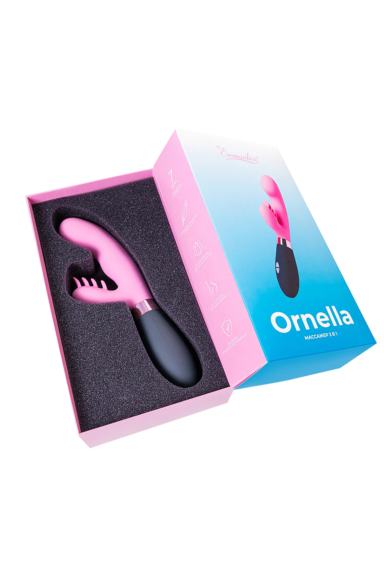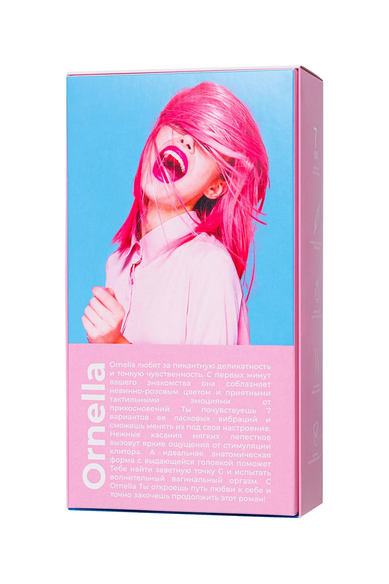 Ornella любят за пикантную деликатность и тонкую чувственность. С первых минут вашего знакомства она соблазняет невинно-розовым цветом и приятными тактильными эмоциями от прикосновений. Ты почувствуешь 7 вариантов её ласковых вибраций и сможешь менять их под своё настроение. Нежные касания мягких лепестков вызовут яркие ощущения от стимуляции клитора. А идеальная анатомическая форма с выдающейся головкой поможет Тебе найти заветную точку G и испытать волнительный вагинальный оргазм. С Ornella Ты откроешь путь любви к себе и точно захочешь продолжить этот роман!